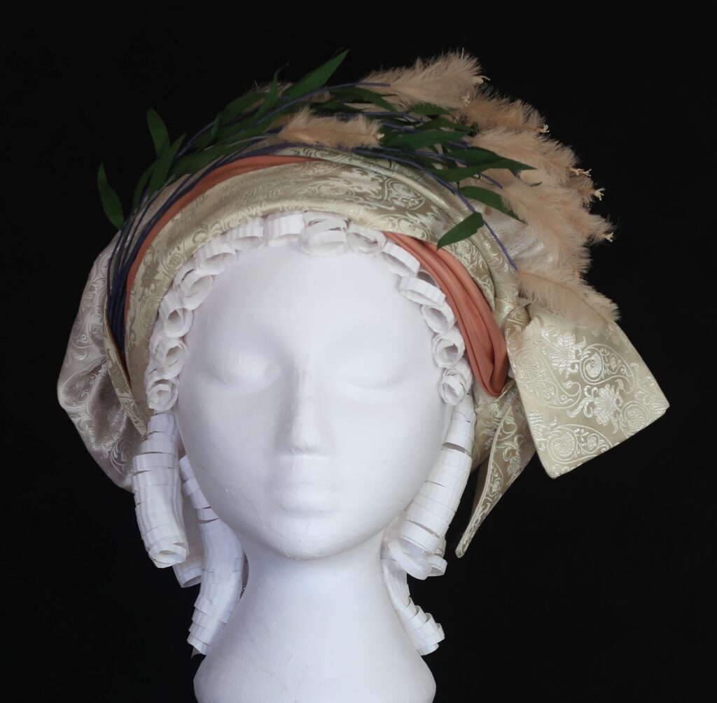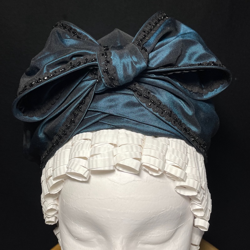 This pattern comes in a download version only. It has a pattern for two different headdresses, one based on a period fashion plate (view A) and one based on a period portrait (B). B has a structured crown and A has a soft fabric bag crown, with several versions on how to tie it.