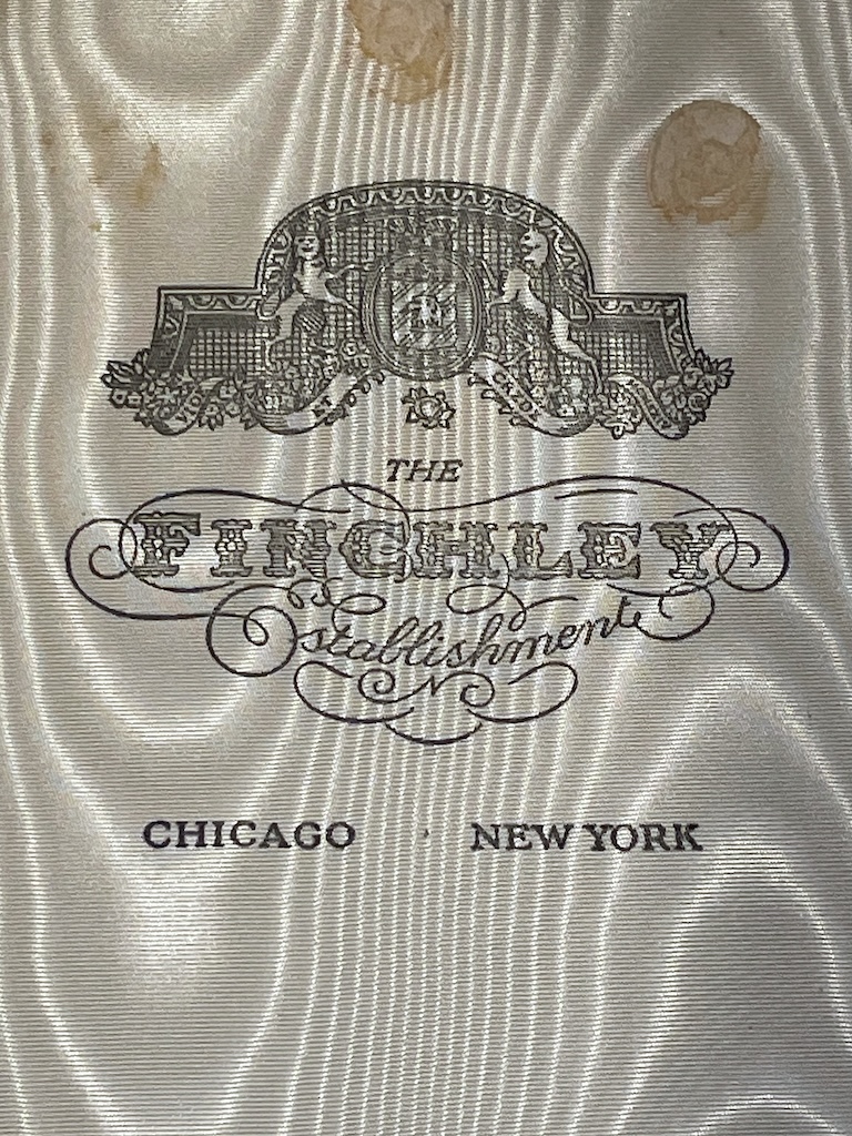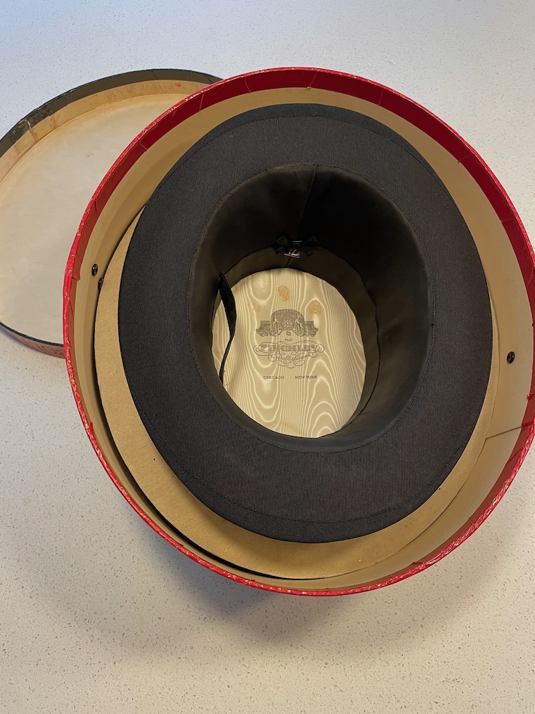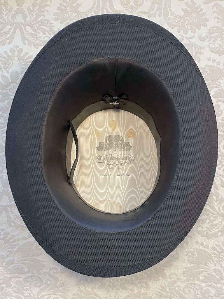 The “Finchley Establishment” was a high end men’s clothing store on Fifth Avenue in New York and on East Jackson Blvd. in Chicago along with some other cities. It was started in 1915. This hat was sold out of the Chicago store according to the hat box. On the right is to crown lining with the printed logo on eggshell white moiré grosgrain silk fabric