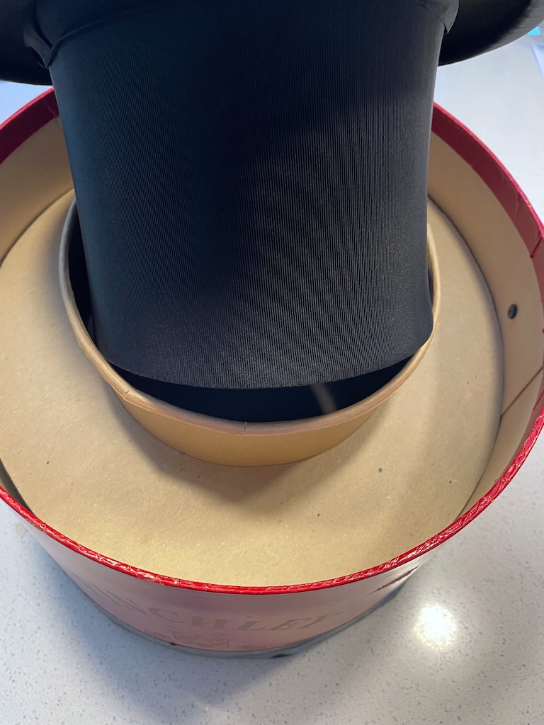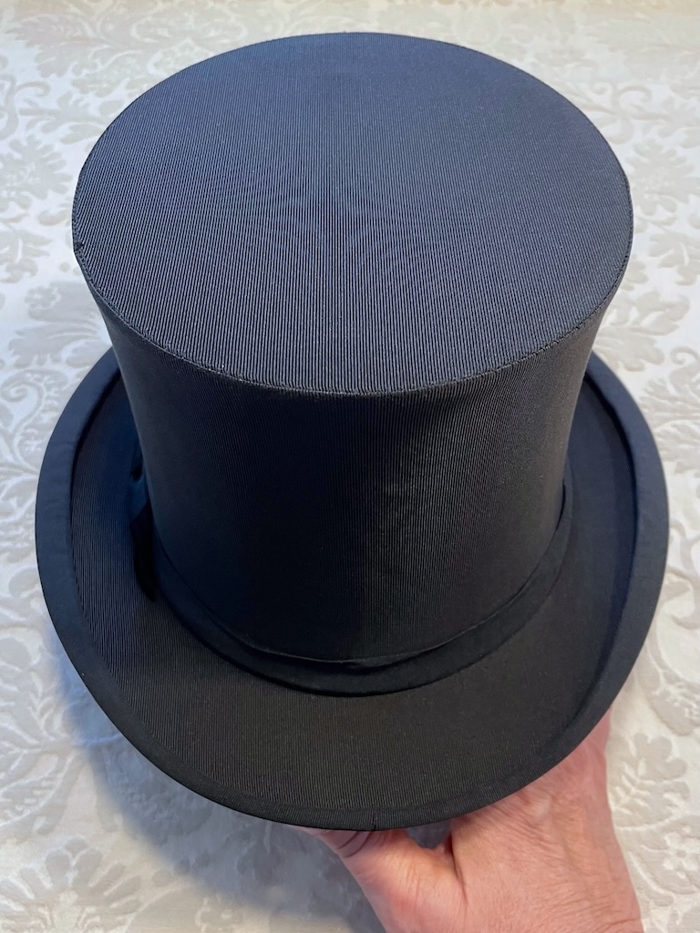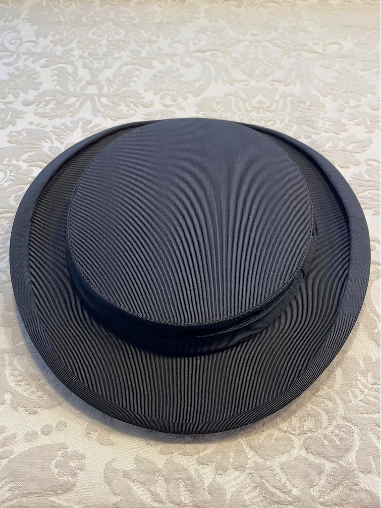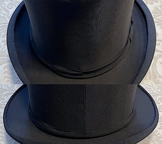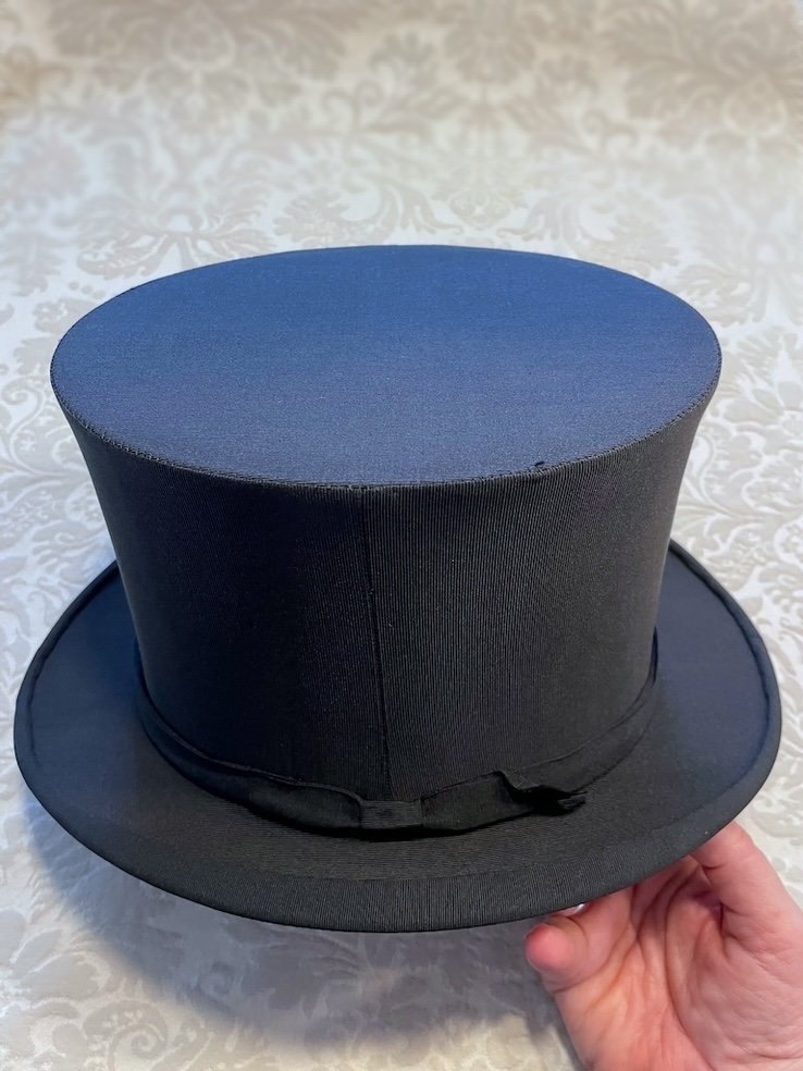 This hat is in very good condition for an early 20th C collapsible hat so it’s a good object along with its hat box to study. I love to look for things like the types of stitching that were used, If they used a machine or hand stitch. Also, what type of materials were used for the outer fabric and the lining. And how it was stored for around 100 years without showing any adverse effects.