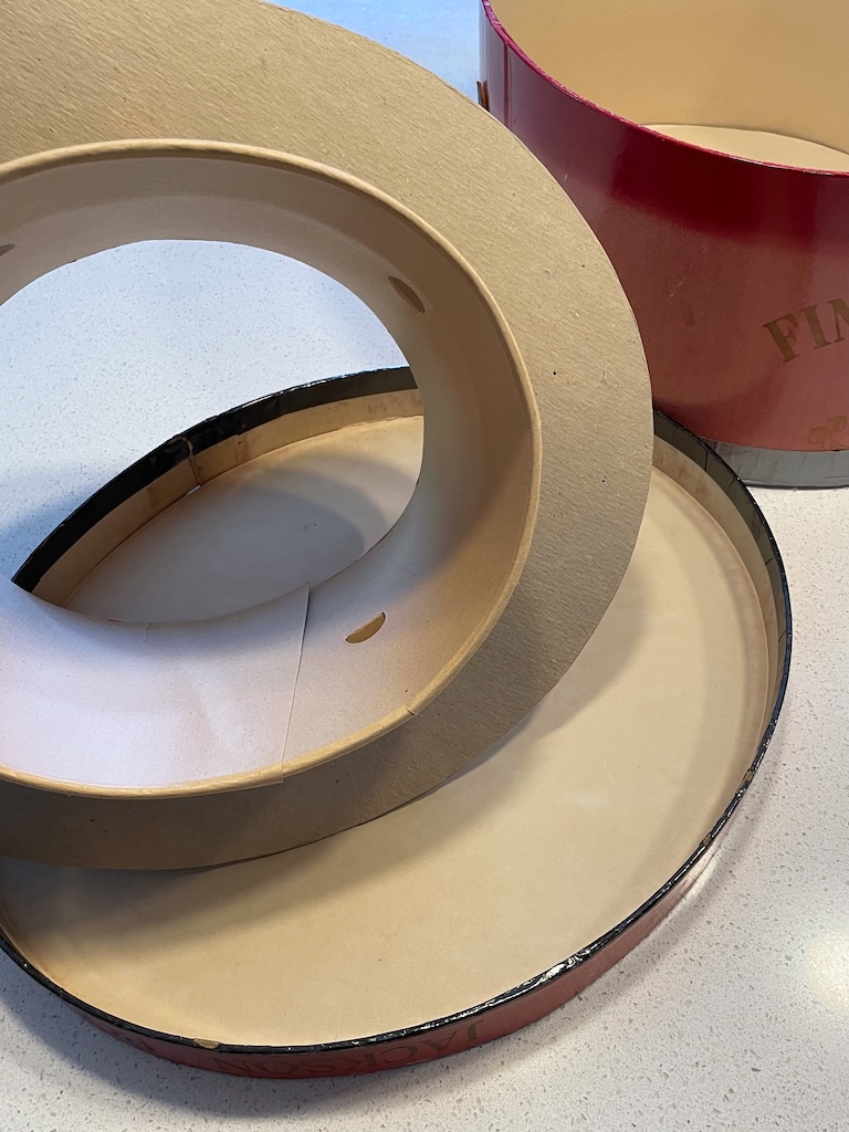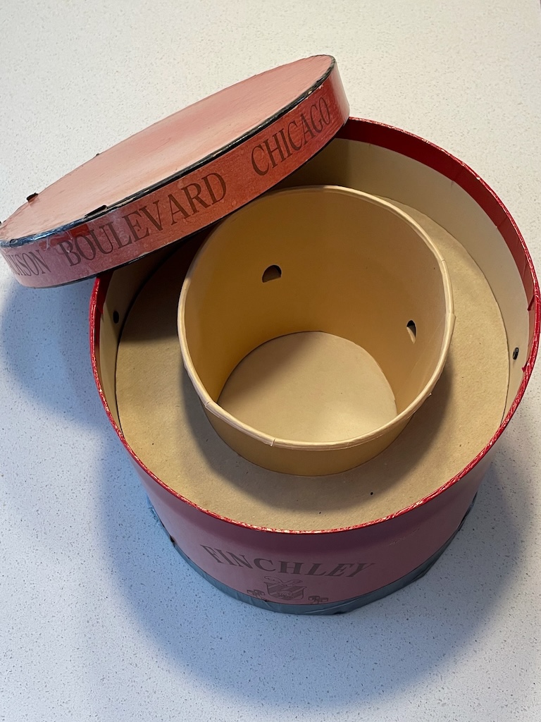 This is what the inside of the hat box looks like when the hat is out. The center of the insert has a rolled edge and 4, half circle tabs cut out (I think for circulation).