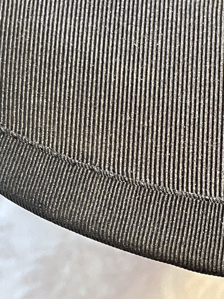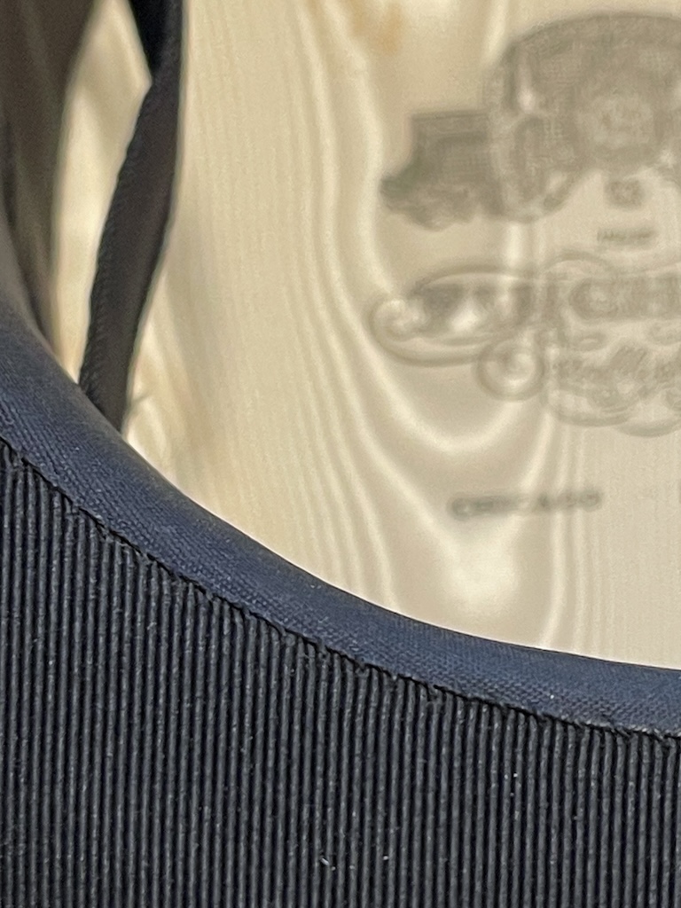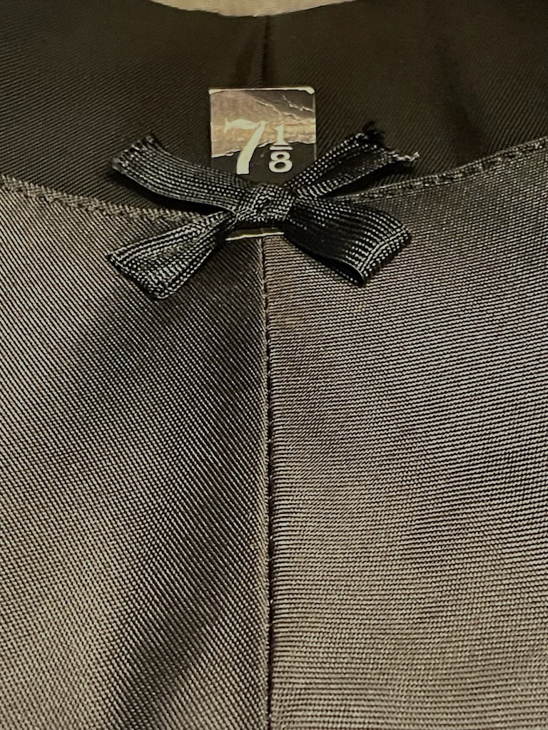 Left; the under brim is covered with silk grosgrain fabric. The lining which you can see sewn to the under brim is a regular weave silk fabric. A find whipstitch was used to sew the lining in. Middle; the brim edge is covered with petersham which is a grosgrain ribbon. The fineness of the bibs on the fabric and the ribbon are nearly the same. The fabric has 80% less ribs than the ribbon. Right; About 1.5″ up from the crown tip along the center back seam of the lining there is a little bow with the size tag still in place. The center back seam is machine stitch.
