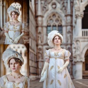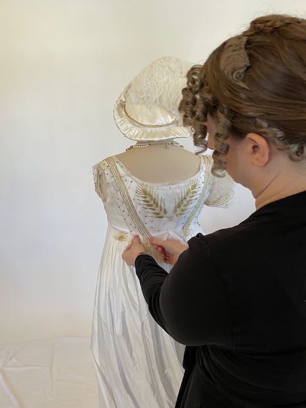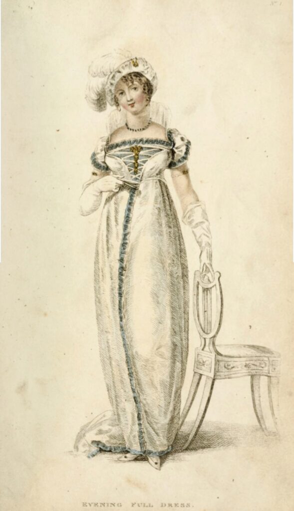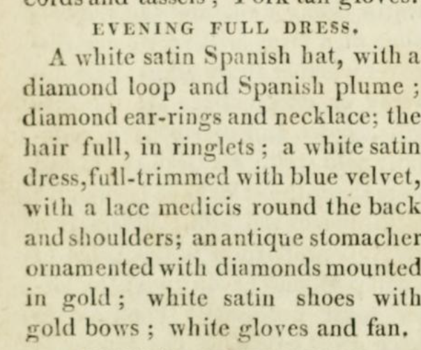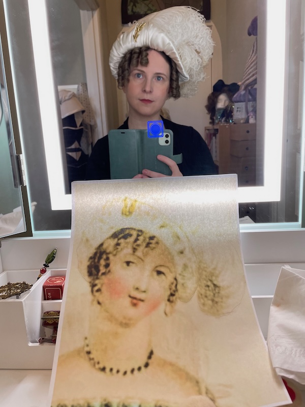 We wanted the hairstyle in the style shown in this Ackermann’s Repository, 1809 Jan-Jun fashion plate. They called the hat a Spanish hat in the magazine. We both studied it a great deal.