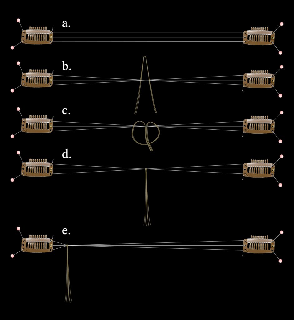 a) On a wig block I pinned two (1-1.25″) toupée clips about 10″ apart. Then tied off a length of sewing monofilament (fine clear thread) in the first hold of the left hand clip, stretched it across to the first hole of the right hand clip, thru the middle hole of that same clip, across to the first clip, down to the third hole, and then across the the second clip to be tied off in the bottom hole.
