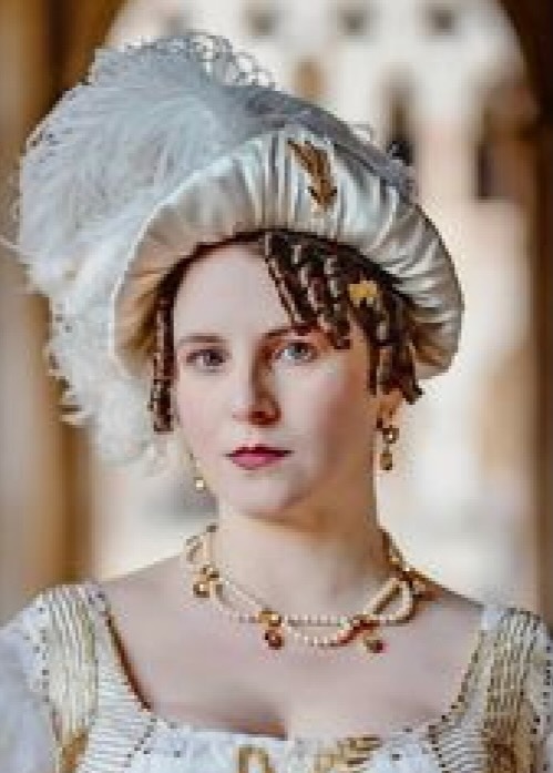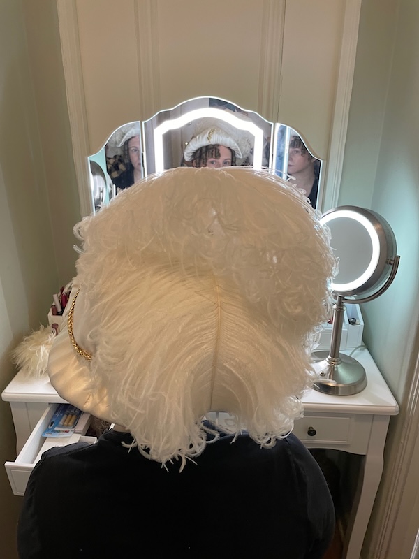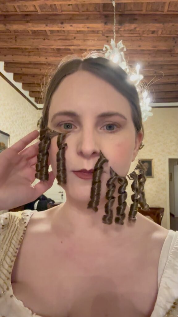 This gown and this hat called for a very different type of curls. Usually I make single or triple curls on one toupée clip or curls added to a mesh base that pins or clips to create curly bangs. So. together Laurie Tavan and I figured out how to make and wear a series of 8 sausage curls on a single line with toupée clips on both ends.