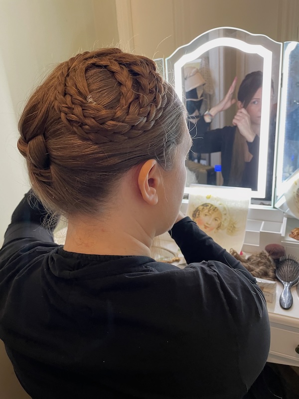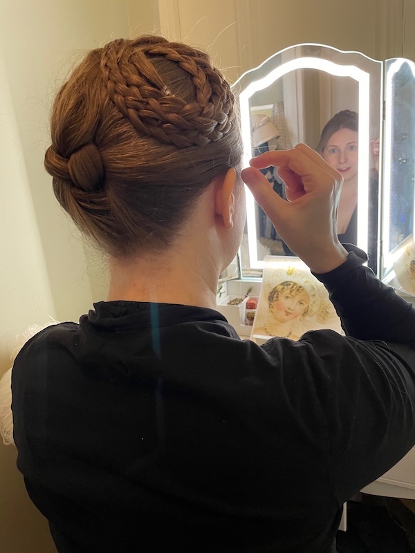 It was important for Laure to have the bulk of her hair so that it would go under the head opening of the hat. As the hat sits off center she twisted her braids so they would all be on the right side and as close to her head as possible.