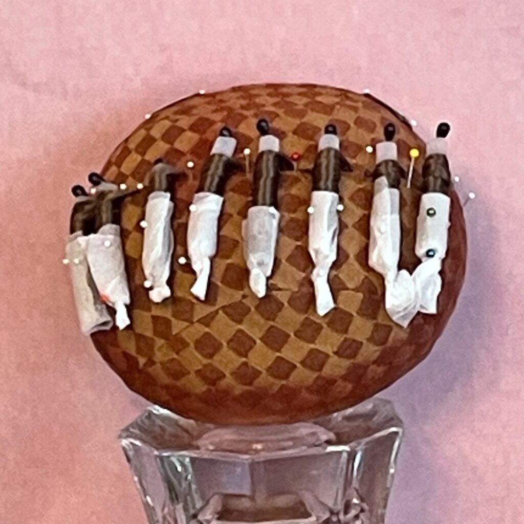 To set the curls I used 1/4″ Polyethylene Tubing which has a 3/8″ O.D (outside diameter), for the curlers. You can get it on a roll at most DYI stores or by the foot then you can cut the tubing into 3″ lengths with craft scissors. I like to use it because it is possible to pin thru it with corsage pins so you can hold your curlers in place. I’m using a chignon base at this point and not my wig block because the chignon base is so much smaller and can fit into a steamer.