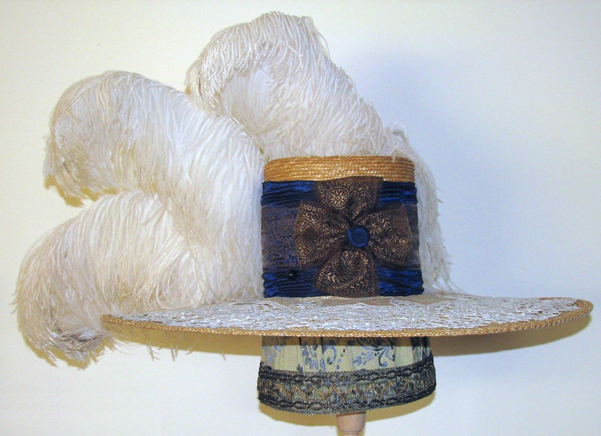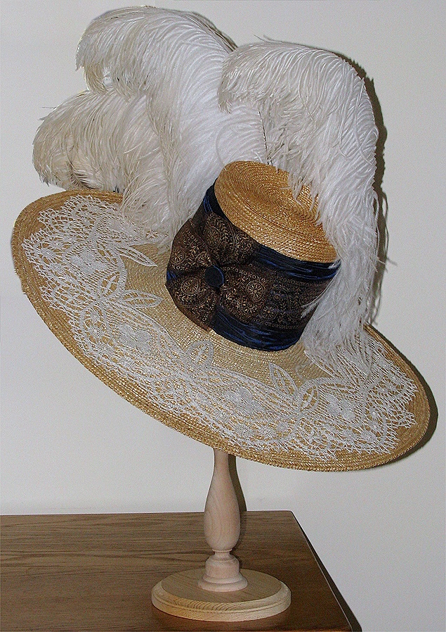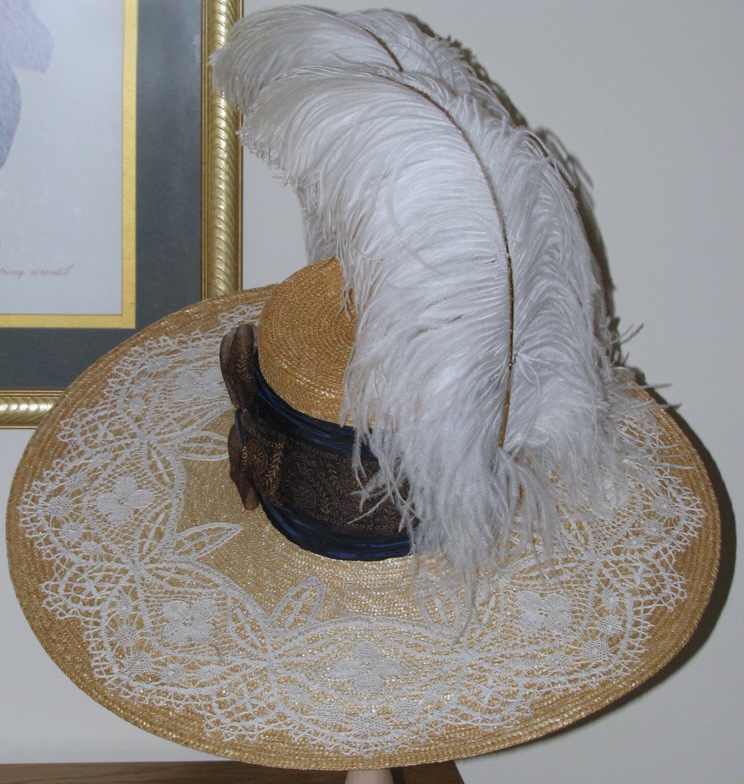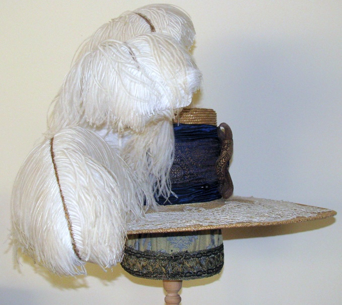 I didn’t want to create a copy of the one in the movie but I did want to make a hat with the same proportions and I liked the lace on the upper brim and the shirred wide hatband and bow. I just made one bow on the side instead of several down the center front because I wanted to add ostrich plumes.