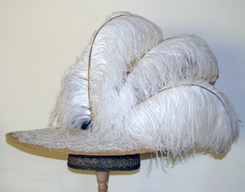 This is the back of the hat. While the ends of the plumes are being supported with wires that go thru the buttons the mid level of the plumes are being held in place with swing tacks. You can see a good shot of a swing tack on my Edwardian Hat two-thirds down the page.