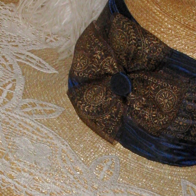 I used a very wide blue-black ribbon for the band and over that I have a sheer ribbon with gold metallic designs in the center of the band. It also makes the bow. I had to adjust the shirring so that it is above and below the sheer ribbon. I did this when I was tacking down the ribbon, if I had left it un-shirred then it would have been as tall as the crown. I added a covered button in the middle of the bow.