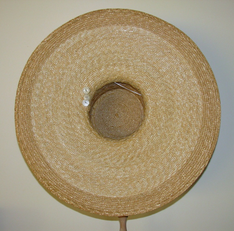 I’m not sure if you can see this but inside the hat the thread that sews the straw together is thicker and lighter than on the rest of the hat. There are two reasons for that. With a chain stitch the inside or under side of the hat has the loop part of the chain and it shows much more and the straw darkened with age but the thread did not.