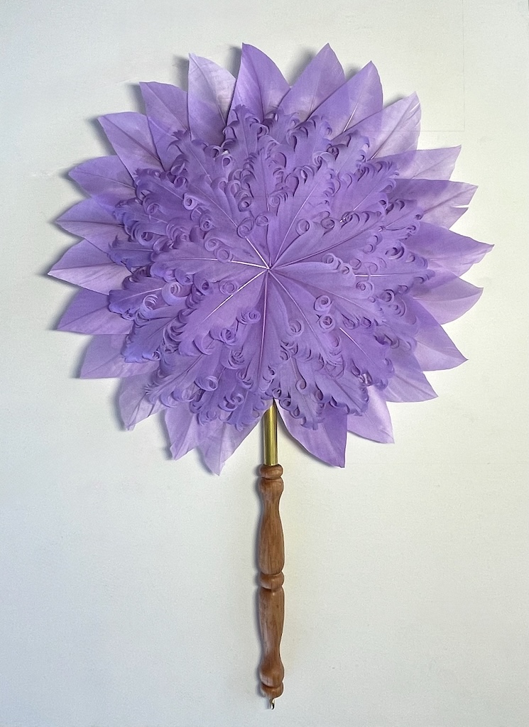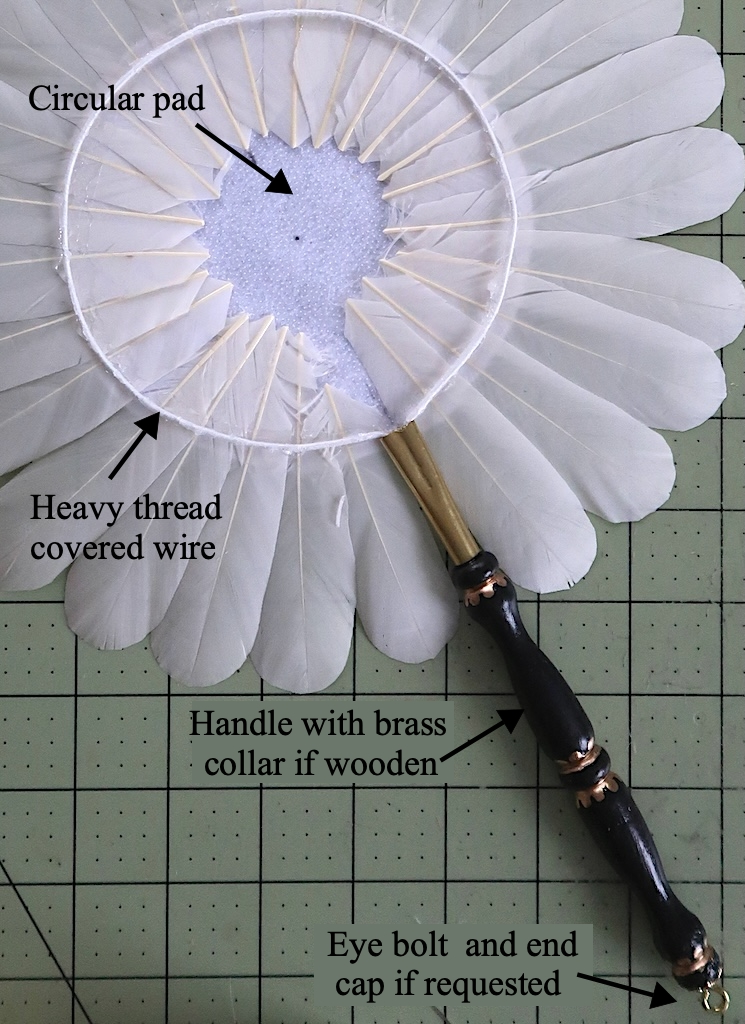The kits also come with a circular pad to glue your feathers onto, an 18 gauge thread covered wire. And an eyebolt and metal cap if you ask and want to add a wrist band or tassel set. This is handle A painted with black enamel and some gold leaf paint added for decoration.