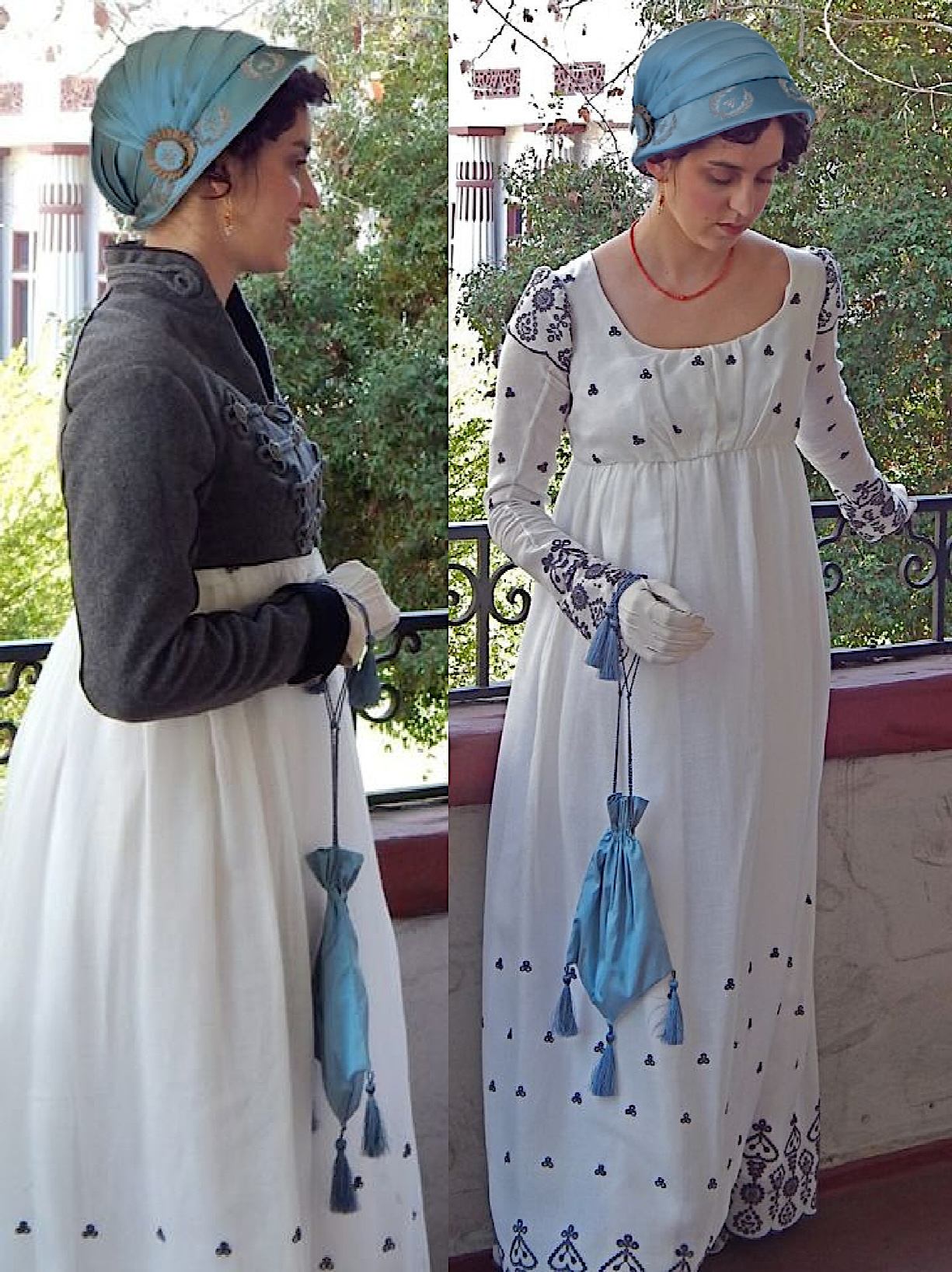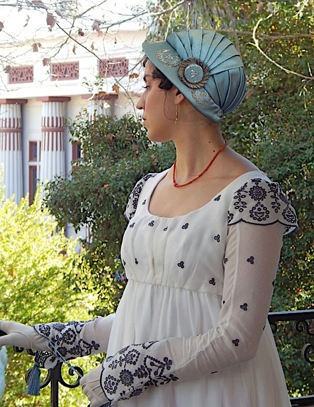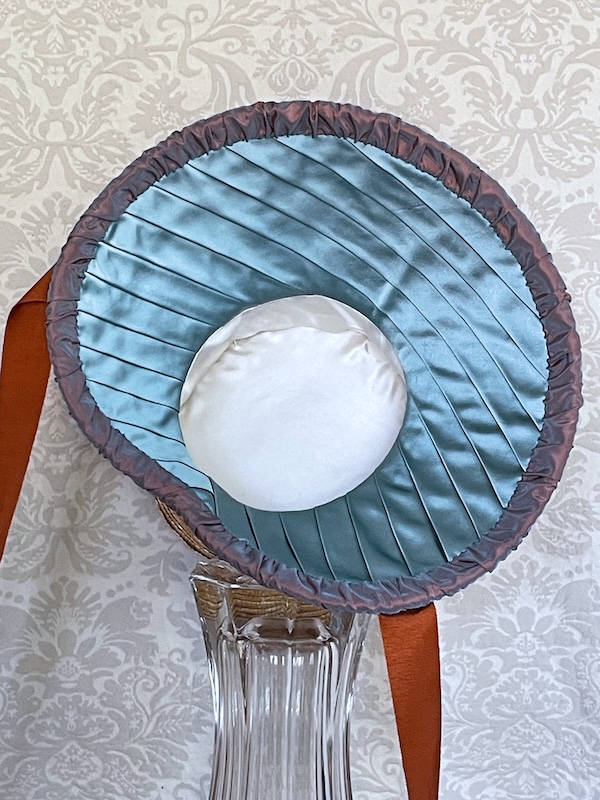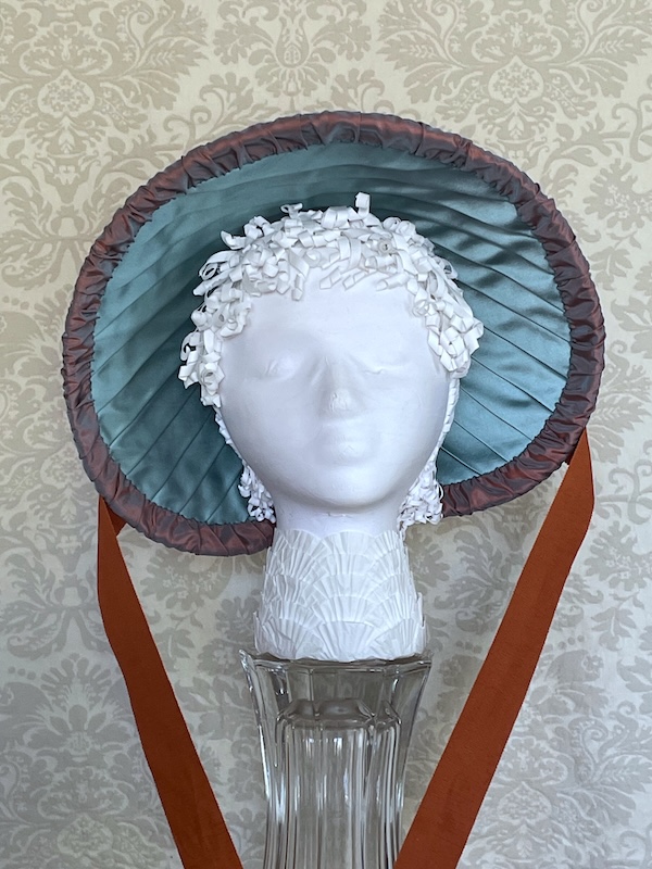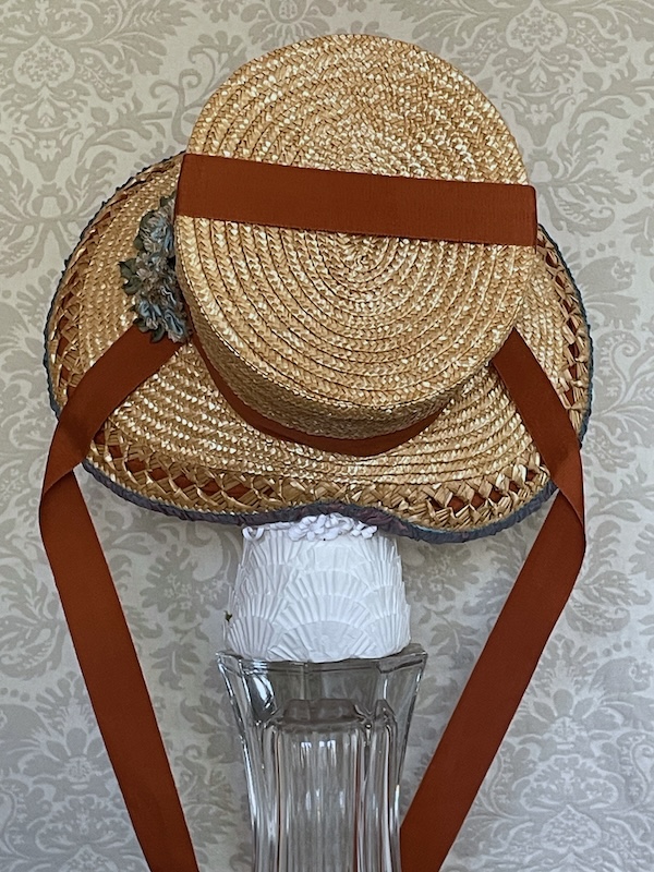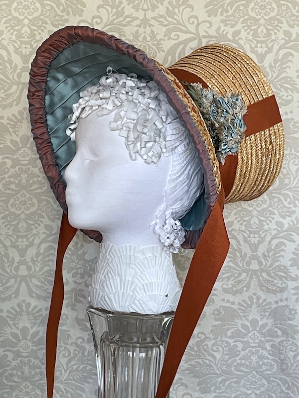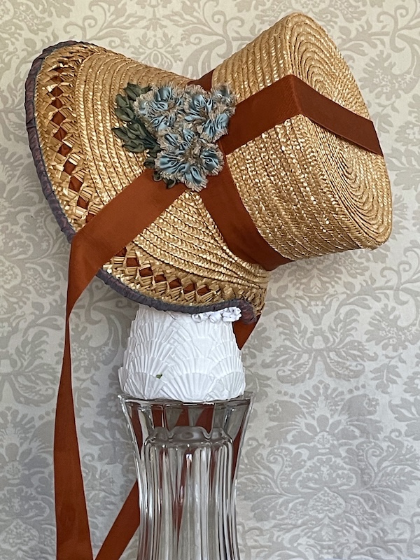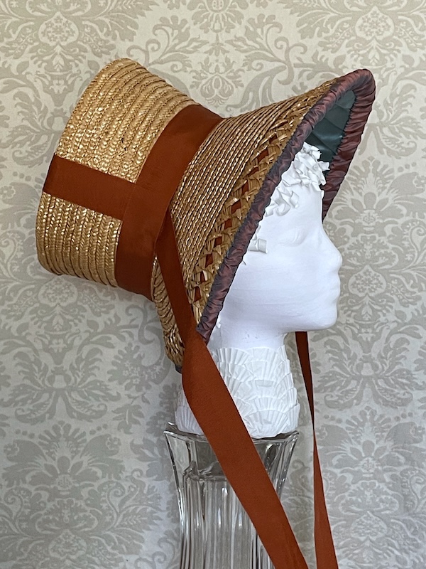 This bonnet was made for the Early 19th Century Seaside Bonnet pattern #37. It is straw over buckram with a plain 7 end plait and two rows batwing plait facing each other to create the diamond shapes. It has a pleated silk brim lining and a cluster of flowers made from the same silk.