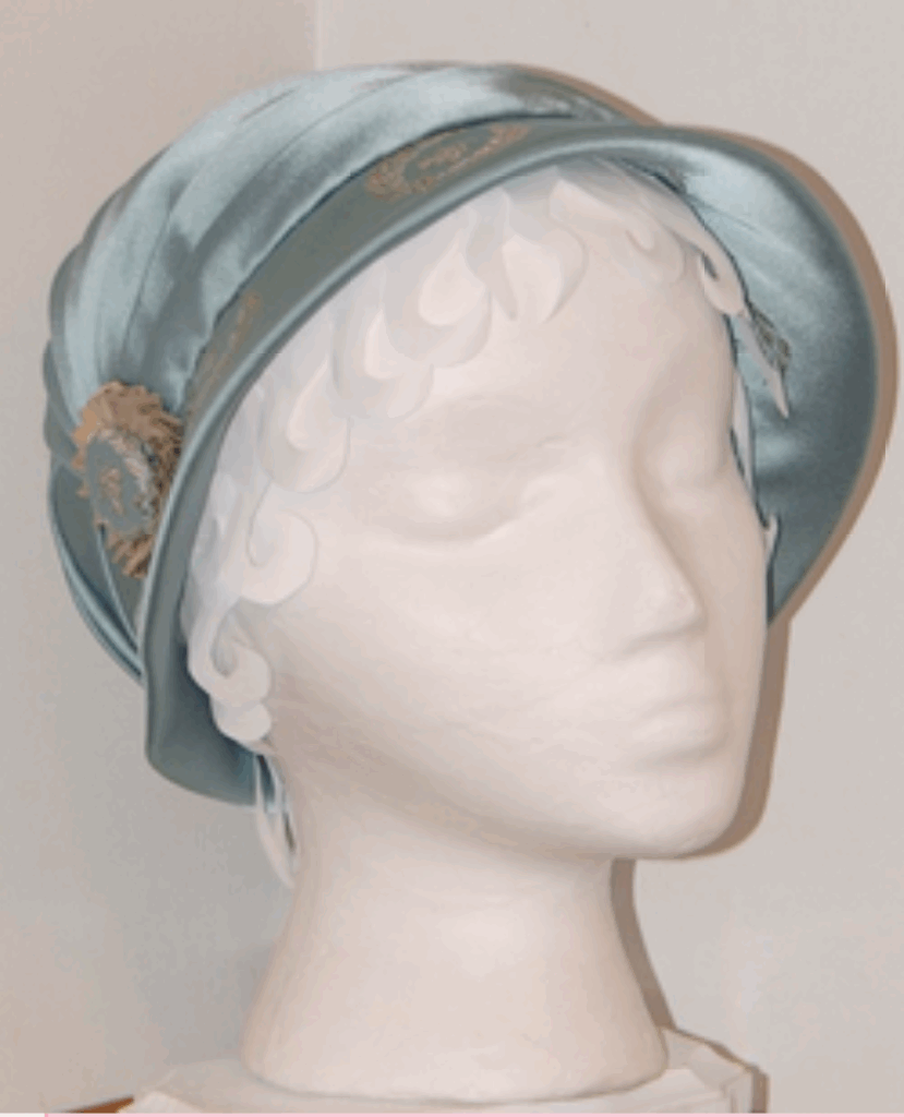 This bonnet was one of the styles of hats worn between 1885-95 near the end of the Gilded Age. It had a transparent brim over a wireframe. And is decorated with a beaded ornament, a floral decoration and an ostrich pom-pom with peacock hurl rising out of the center.