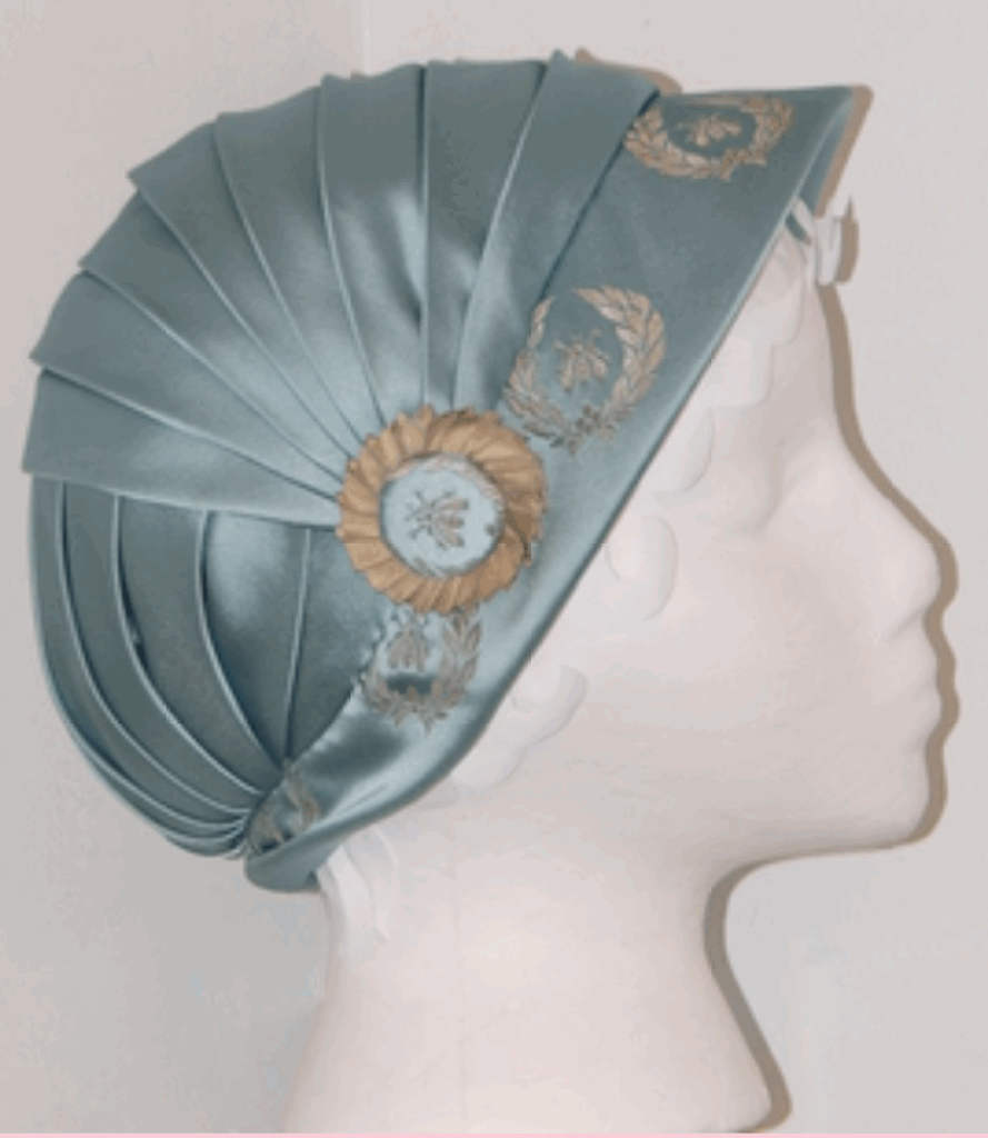 This cap has knife pleats on both the upper half and the lower half of the cap. The pleats run across the front half from side to side and cone up from the bottom center to meet the pleats that run across the upper half of the cap. This cap is a small which means 21 or maybe 21.5″ and would fit someone with shortish hair cut like a Titus Haircut.