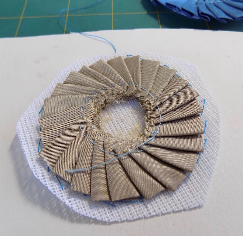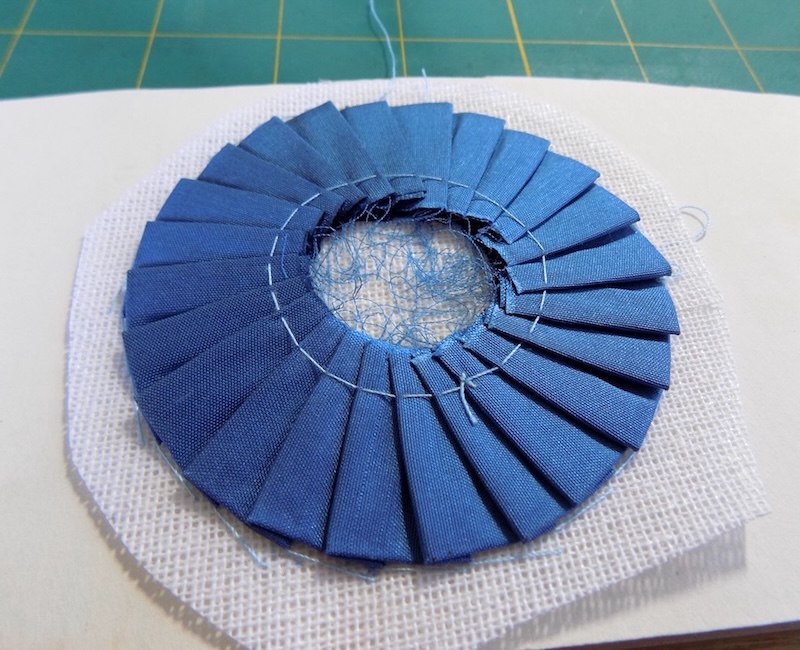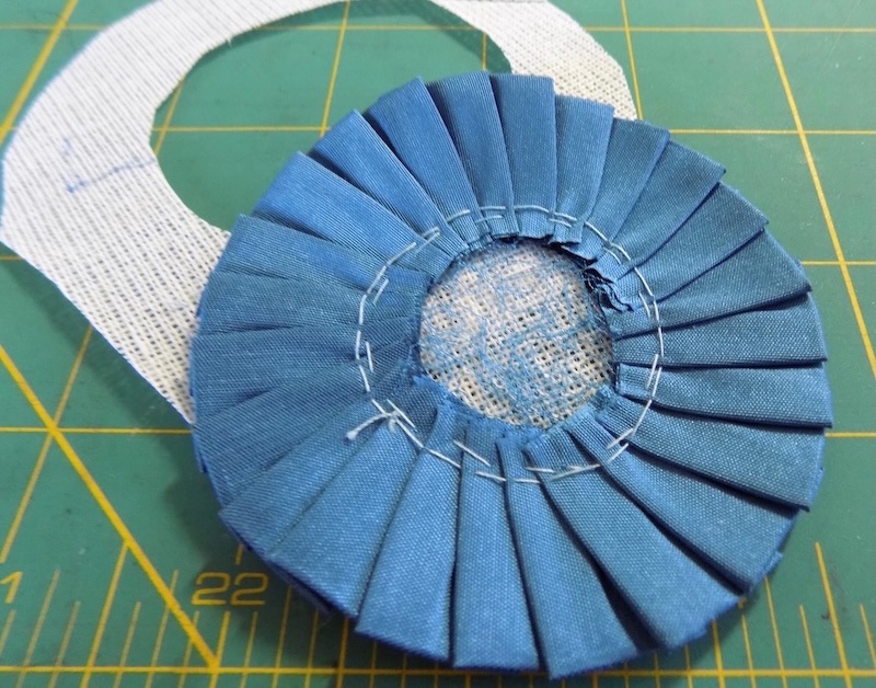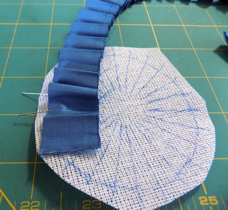4) I took a stitch through the buckram onto the position the pins were taking along the outer circle. Moved the pins to the next pleat clock wise. Tack those down and continued around the entire circle. To the end.