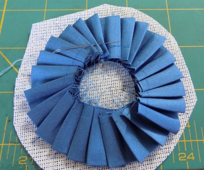 7) Pull on the stitching until the hole is as small as it will get and the pleats start to lay flat. Use a needle probe the distance between each pleat is even.