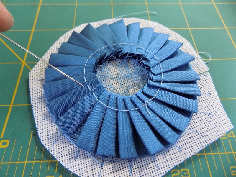 12) This is the finished cockade I know I would have done better with a pleater and petersham. I have made petersham cockades the you don’t need to control the outside edge at all just make sure that you choose the correct width of petersham that is one half as wide as the cockade you want. Then use the stitch in step 6-8 and tighten it as much as possible. Flip the cockade over and do the stitch on the other side. Do the stitching just in from the very edge.