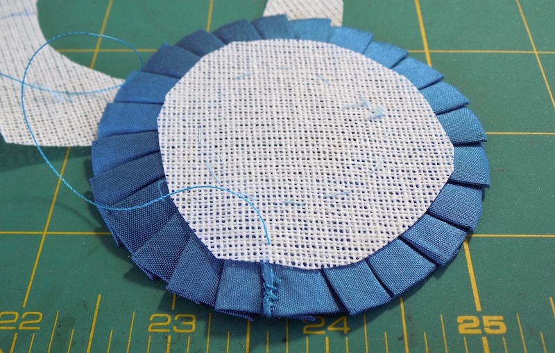 11) For the second layer repeat the same steps but you should start with a 1/3″ knife pleat. You will need the same ~26″of 2″ wide fabric folded and pressed long ways.