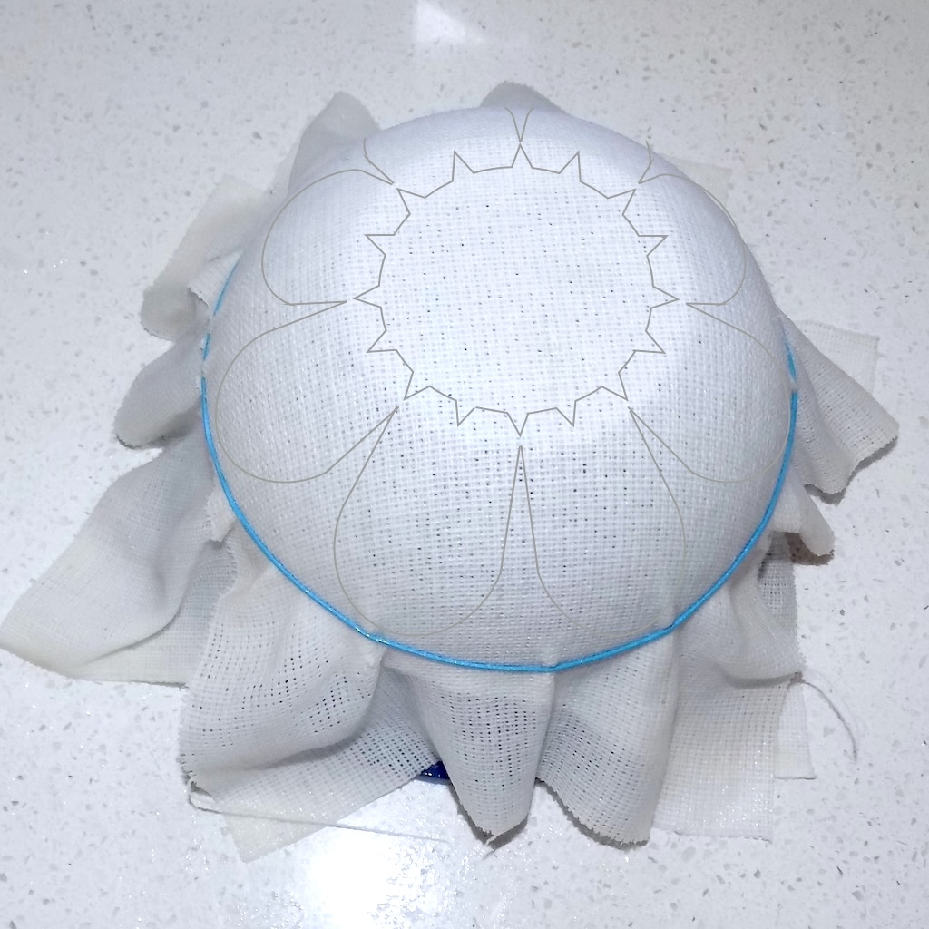 The only differences are that the shape of the tips of the petals are more rounded and when dry I trimmed the buckram as in this photo. That way I could use the tabs to outline an oval shape. I traced the closed frame to a piece of flat double buckram. Because the tabs were glued to the edge of the oval the overall shape was an oval.
