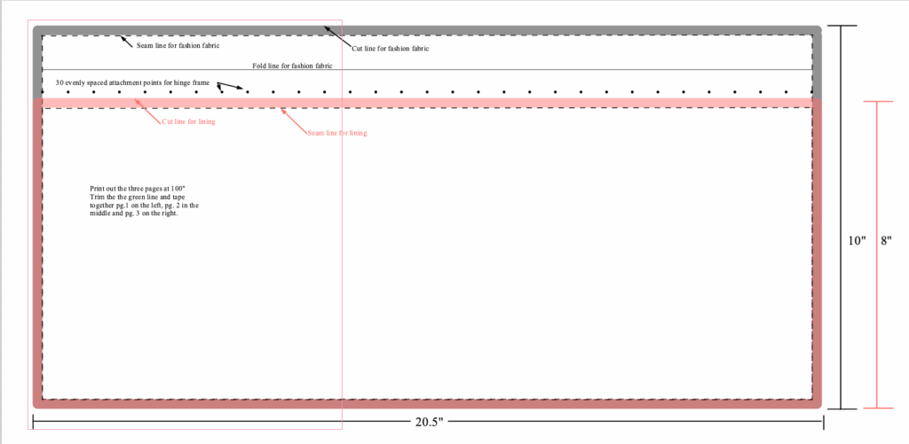The 6″ diameter gives a circumference of about 20″ so, I went with that. 8-8.5″ deep seemed good so I drafted up this pattern. Below are two pdf it you want to print it out. Unless you find a frame with 30 attachment points they will not be that helpful.