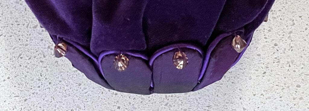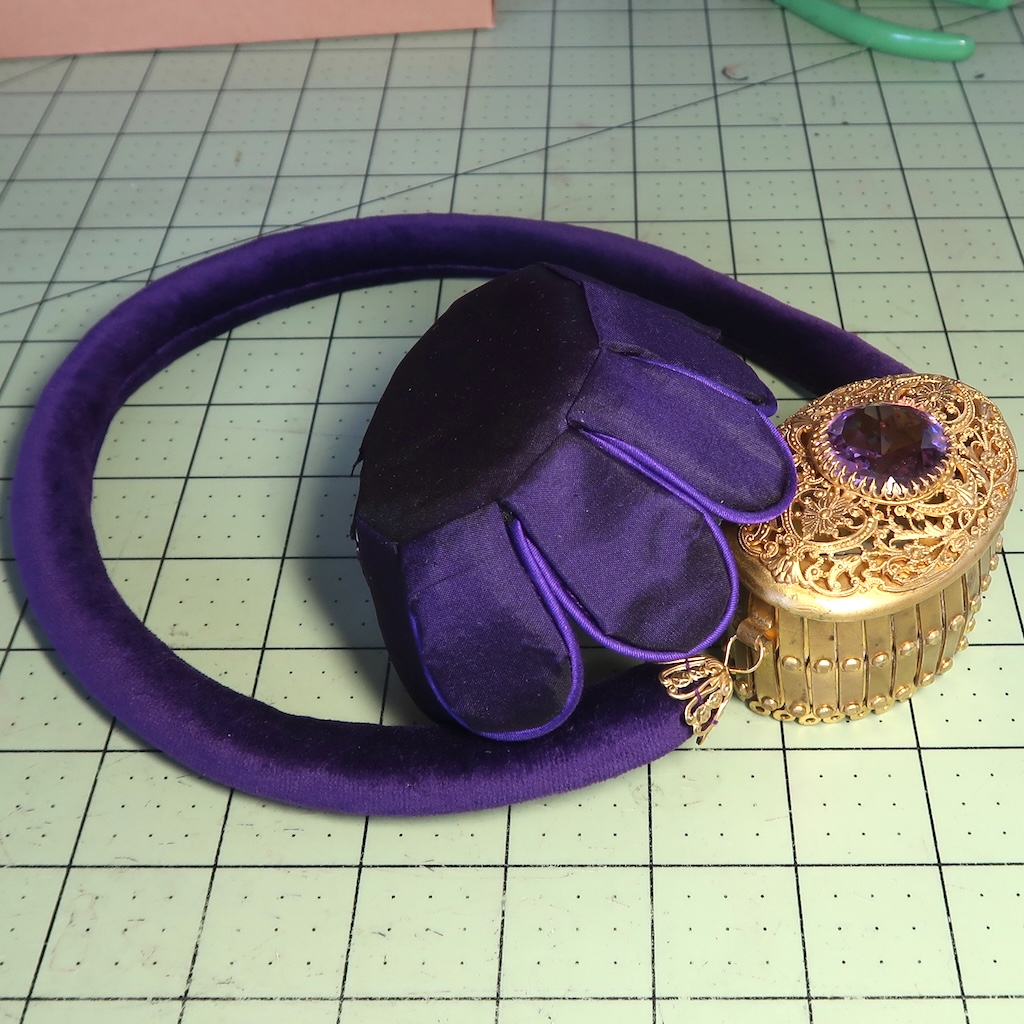This is what the base looked like up close. The bag is glued into the center oval of the footing and each of the petal shapes is stitched to the inside of the bag through the beads. The oval of the footing needs to line up with the oval of the cap.