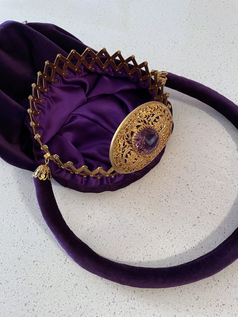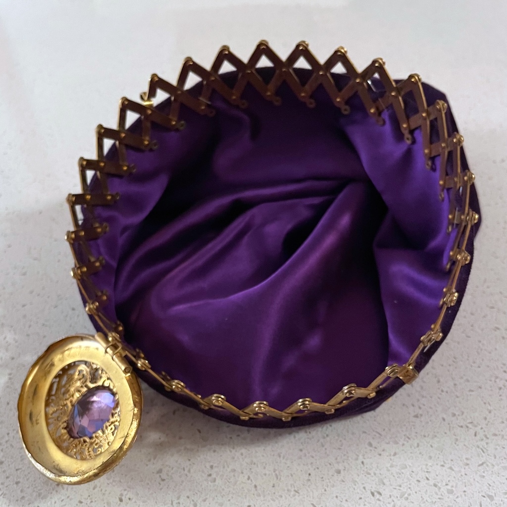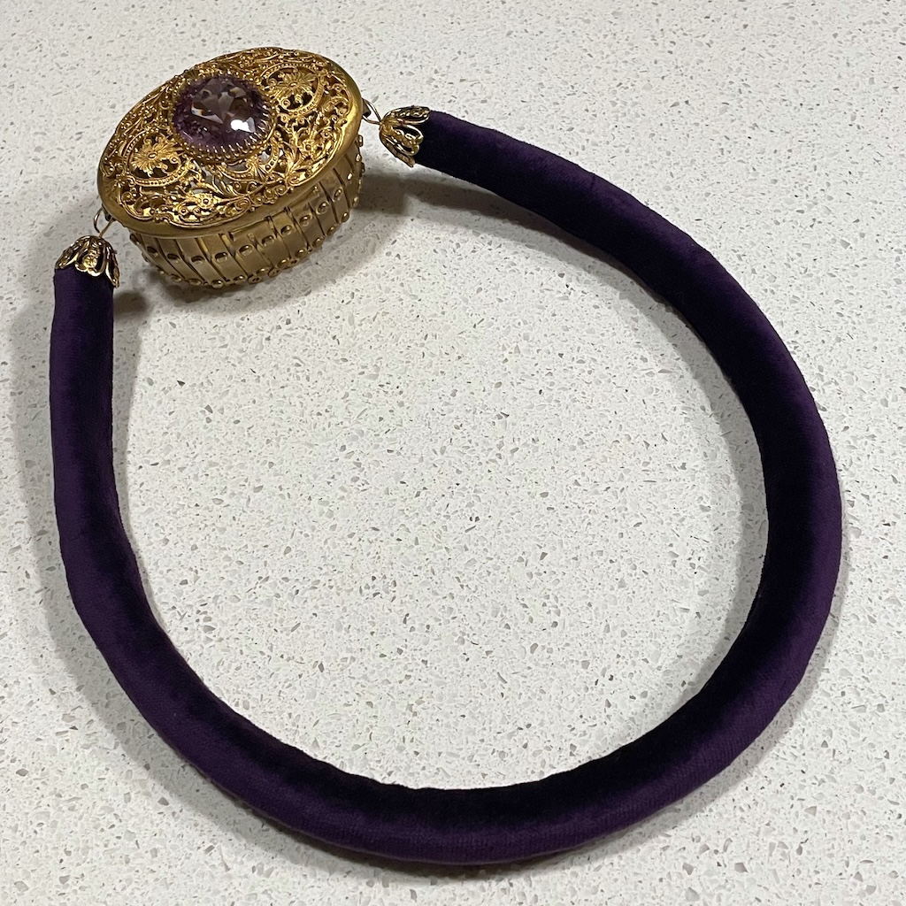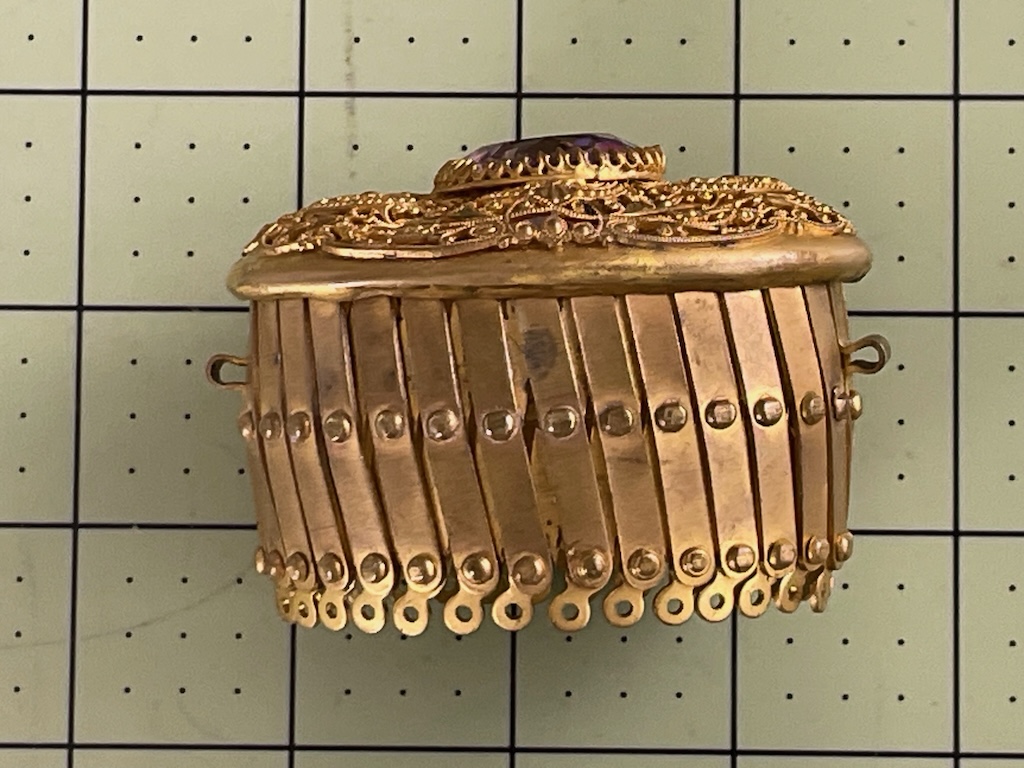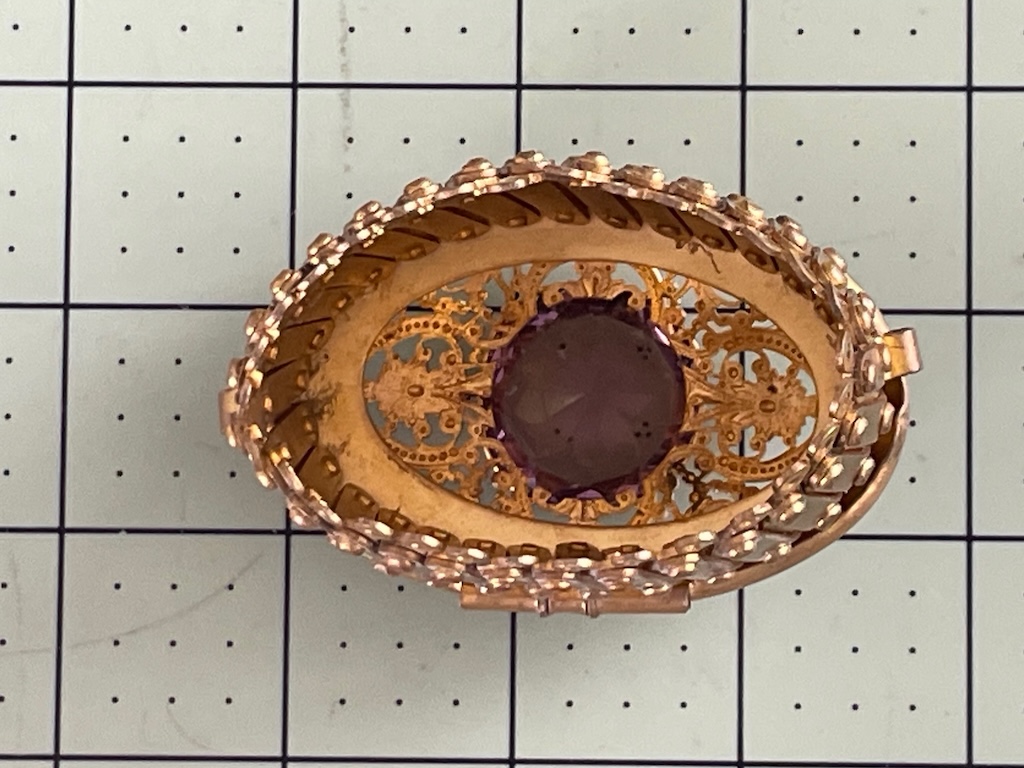 I found this hinge gate frame on EBAY I was drawn to it because it was the only oval (not round) frame I had ever seem. And with the purple stone and filigree cap, it was gorgeous for sure.