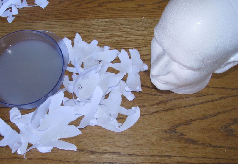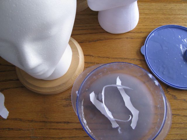 I started by ripping three letter size pieces of 25% rag paper up into strips. I tossed any of the strips that had a cut straight edge away. It usually took three pieces of paper to cover the areas of the face that would not later be covered with hair these can be ripped at the same time three pages thick. On the man’s head I covered the entire head figuring that his scalp would be more likely to show thru this took five and a half sheets. You can usually buy this kind of paper at a copy center by the sheet. I chose rag paper because I figured it would hold together better when wet I never experimented with regular paper. I have done Papier-mâché projects in the past where I used a white glue like Elmer’s glue to wet the paper and create the hard surface but this left the heads shiny which I did not want so I went back to the origins of Papier-mâché and decided to use a starch to hold the paper on. My formula was 1 cup of water to one Tablespoon of cornstarch and 1 Tablespoon of powdered sugar. I added the cornstarch and sugar to the water in a small sauce pan then stirred until it was dissolved, once dissolved I turned on the heat and brought it to a boil and boiled it for about a minute. After I made my heads I learned that if you add oil of Cloves to the mixture there will be less of a change that the paper will develop mold something I would have done as a “just in case” even though I live in a fairly dry environment.