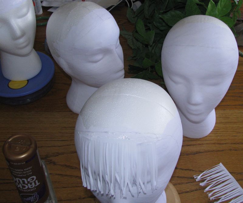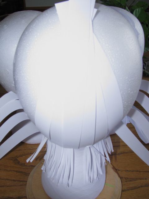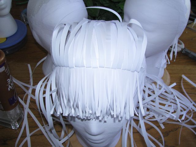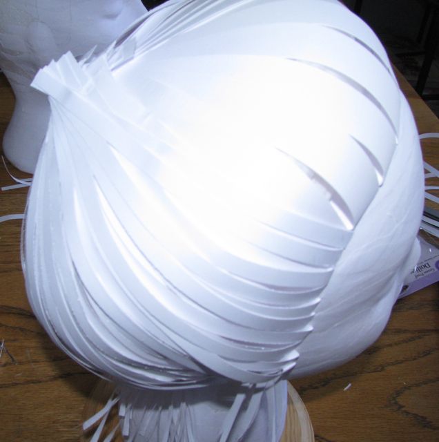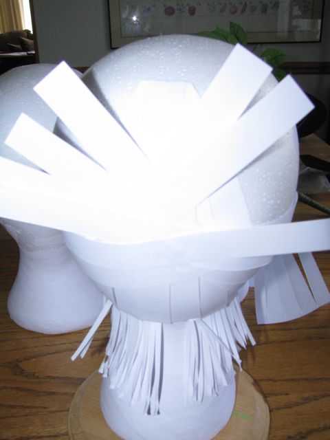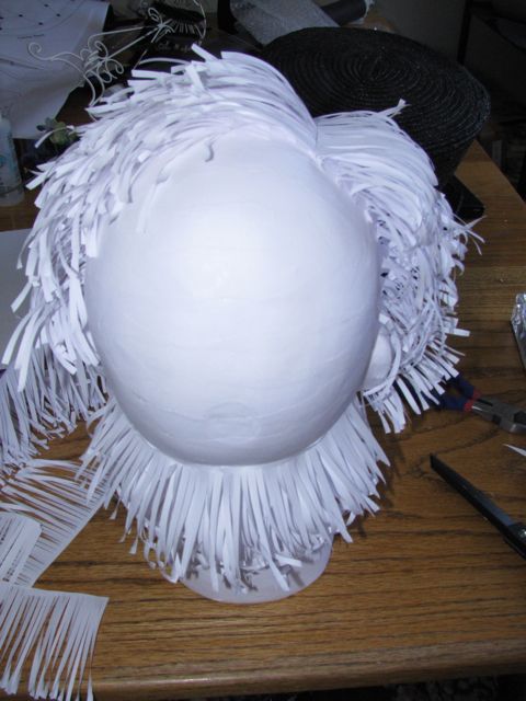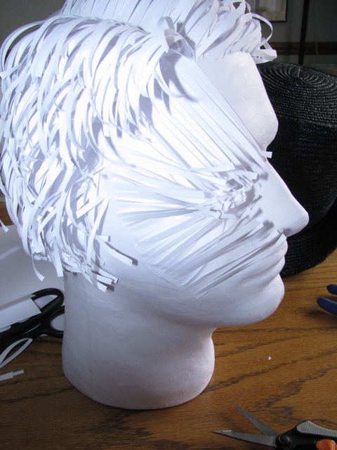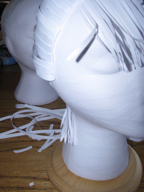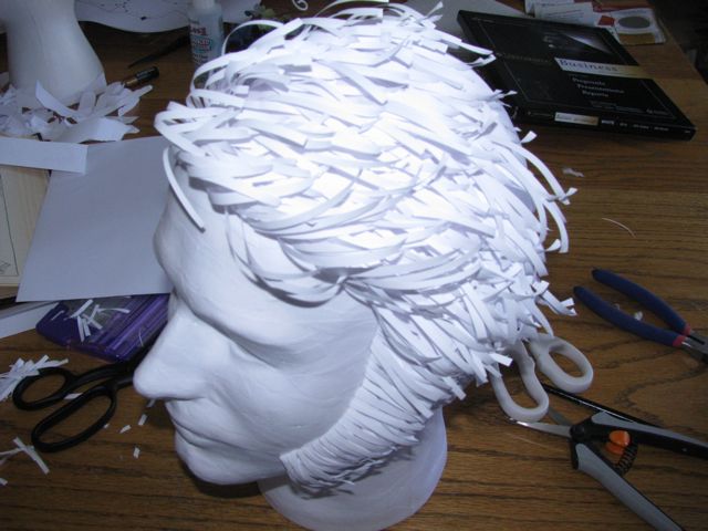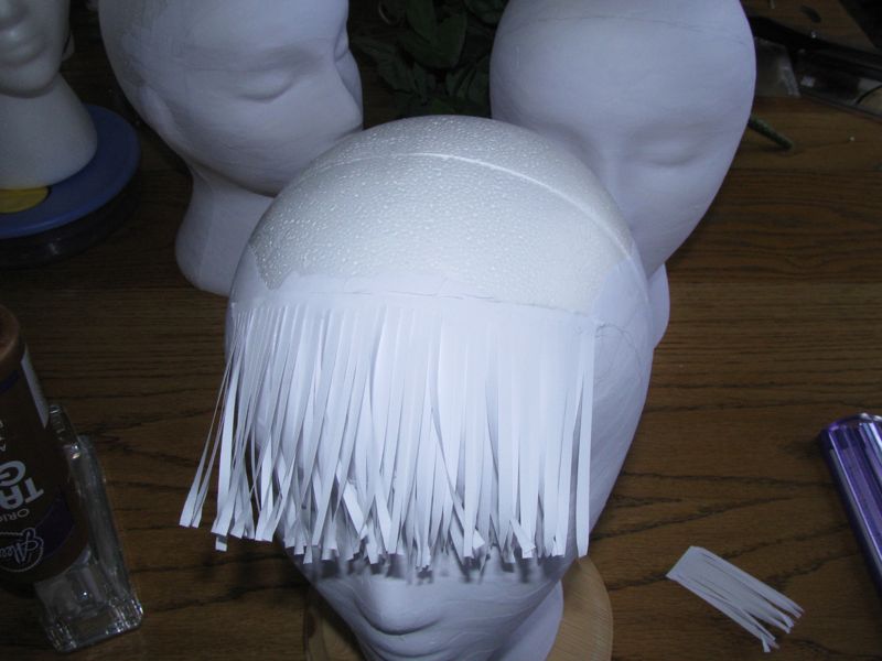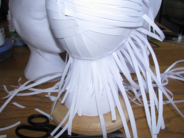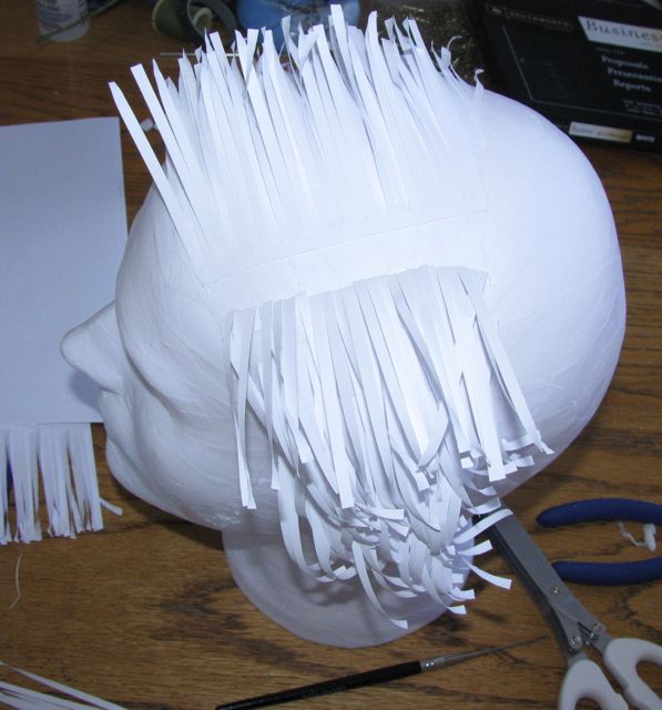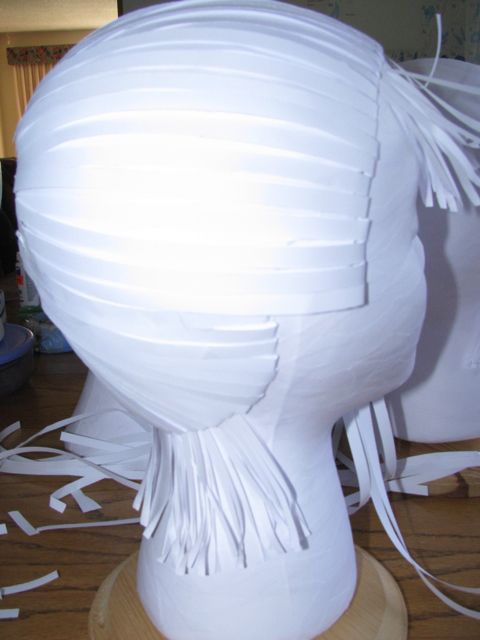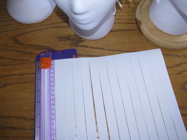 1) An old style paper shredder that only cuts the paper into ¼” wide strips and does not also crosscut the paper. This way I could cut long 9” by 36” pieces of paper into long 36” strips. But for my first heads I used a paper cutter and cut only 11” strips. These worked for all things except the chignon braid when I needed to glue the 11” strips together to get 44” strips it was time consuming.