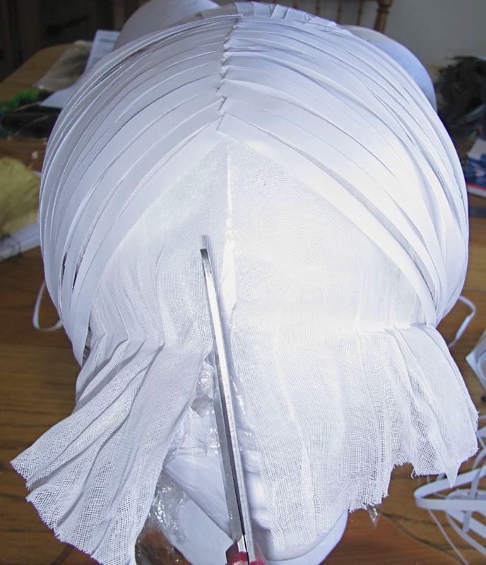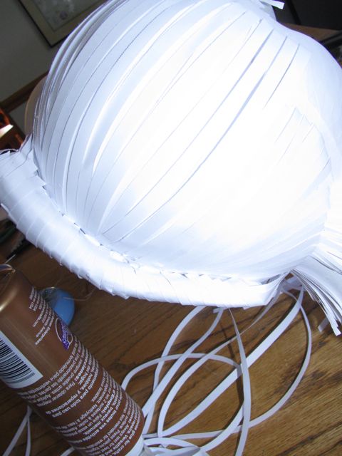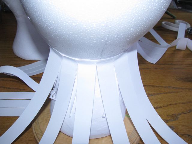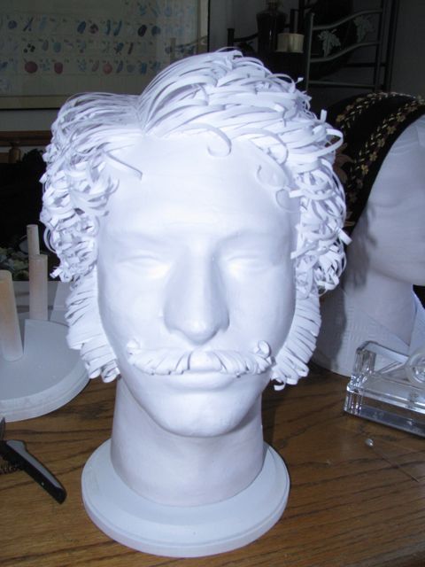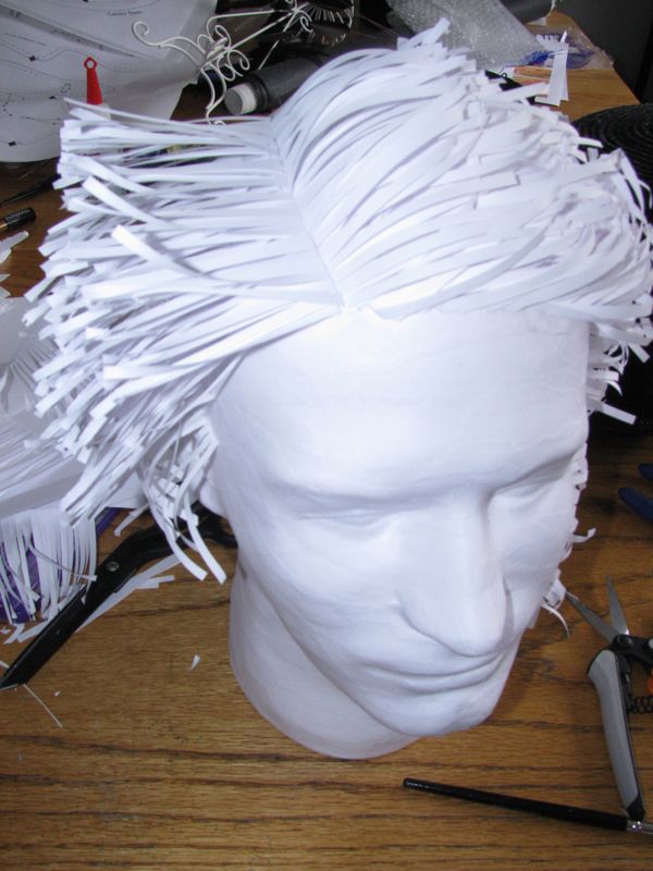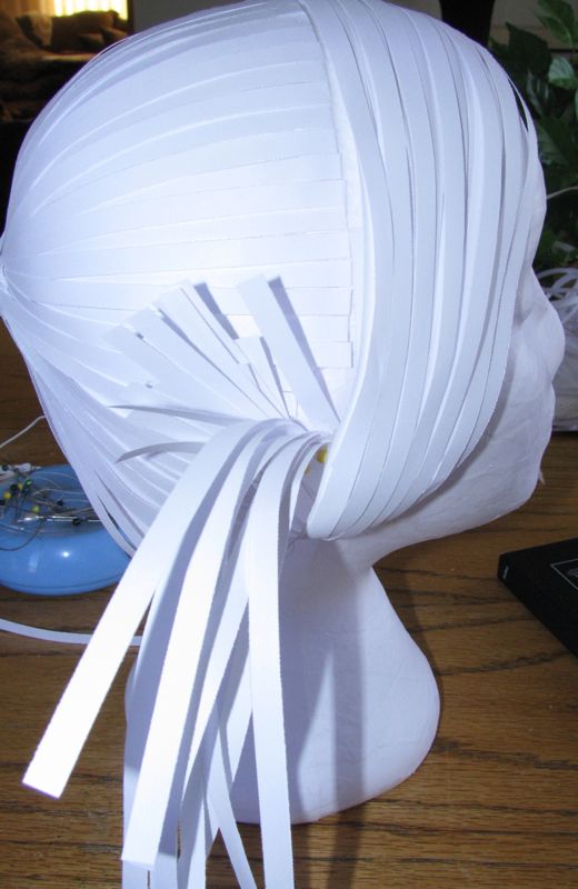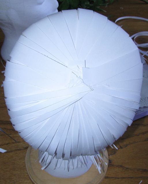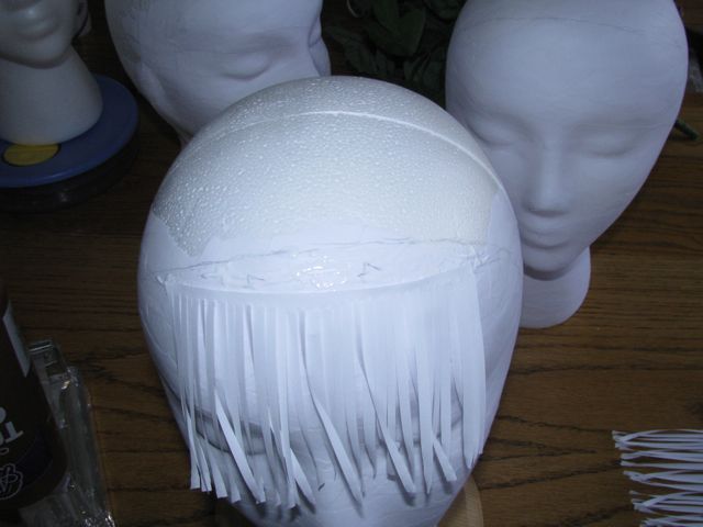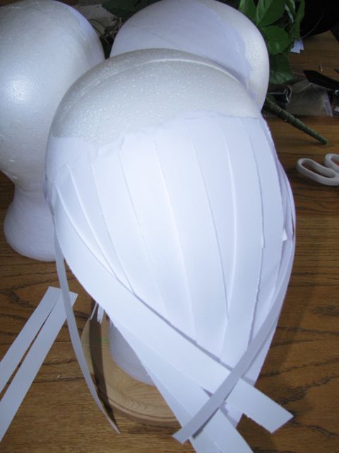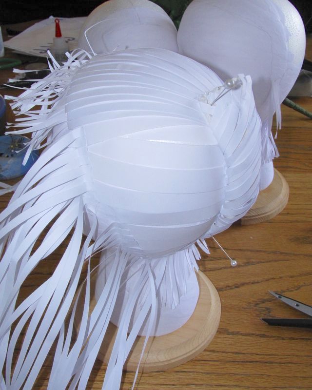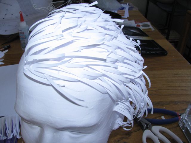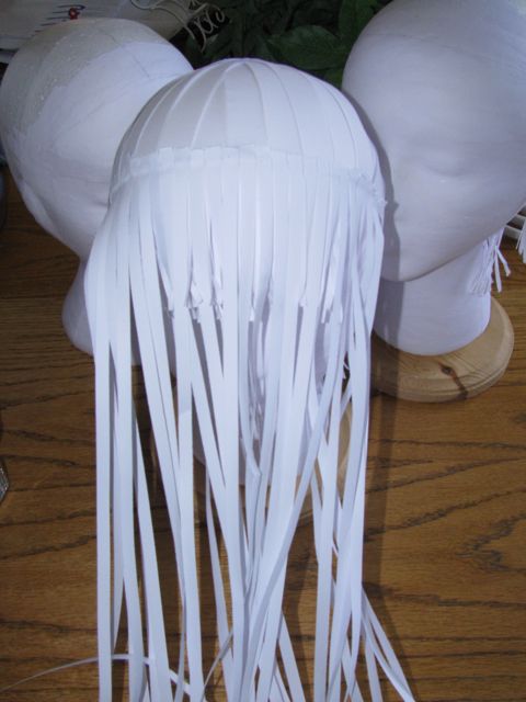 1) An old style paper shredder that only cuts the paper into ¼” wide strips and does not also crosscut the paper. This way I could cut long 9” by 36” pieces of paper into long 36” strips. But for my first heads I used a paper cutter and cut only 11” strips. These worked for all things except the chignon braid when I needed to glue the 11” strips together to get 44” strips it was time consuming.