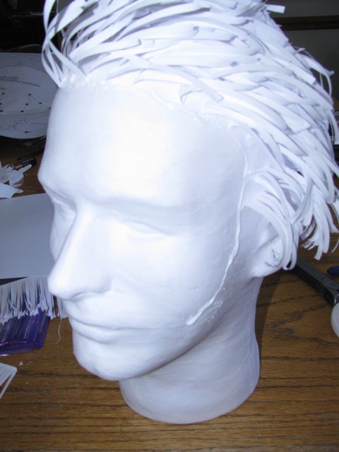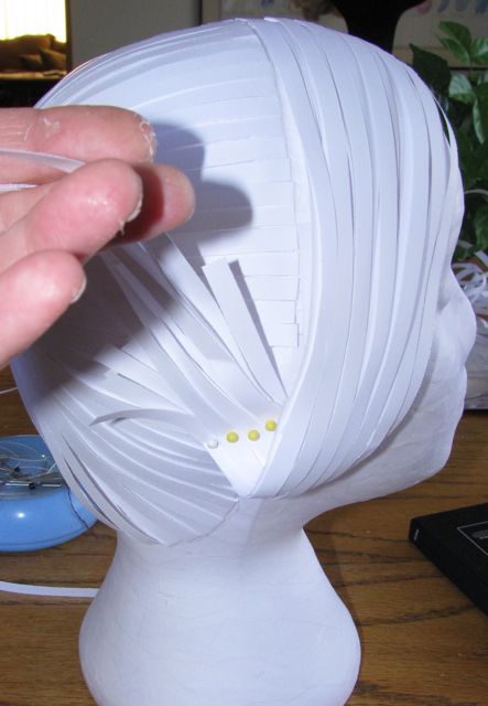1) Follow the same steps that I would do with the finer ¼” strips with wide ¾” strips. The strips I used here where cut with the table top paper cutter without the last ¼” of paper cut that way they can be glued to the head in strips that follow the hairline. The last ¼” inch is glued down and when dry the paper is folded back on itself.