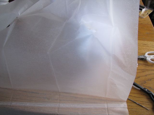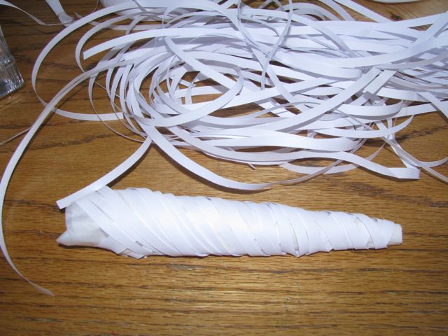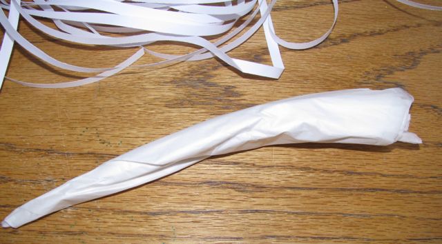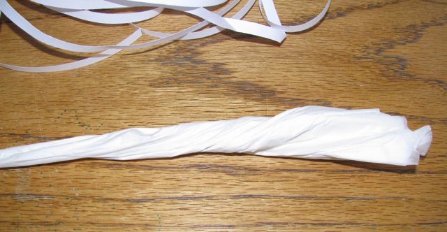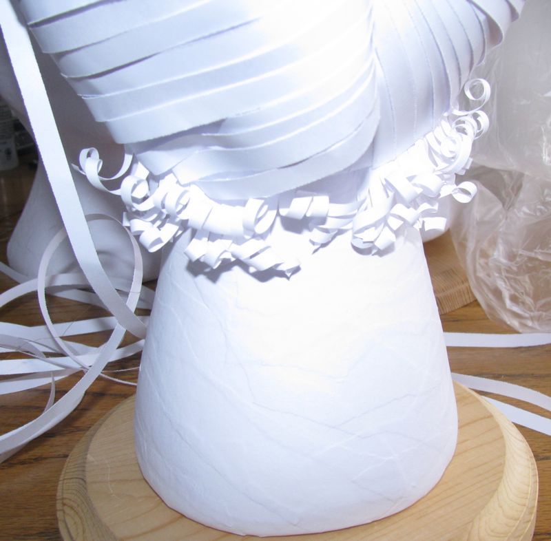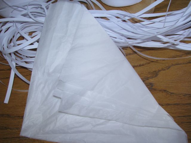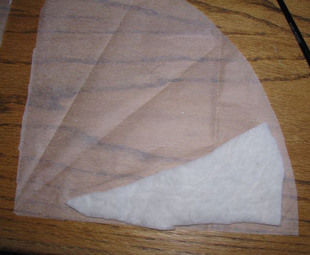 A 1/4 circle of tissue paper was folded around a wedge of batting to cover it and form a long narrow cone.