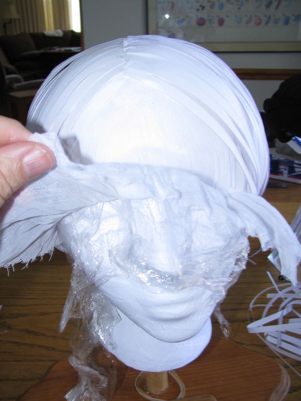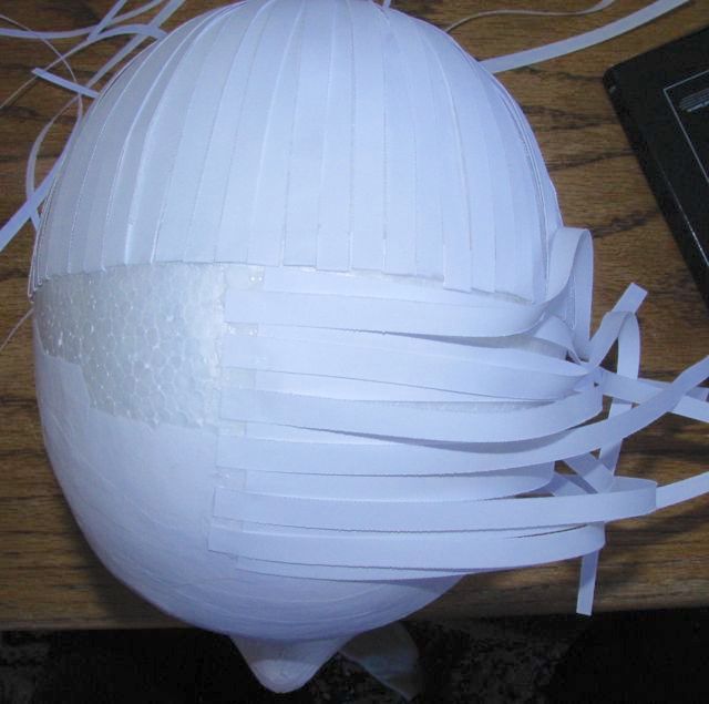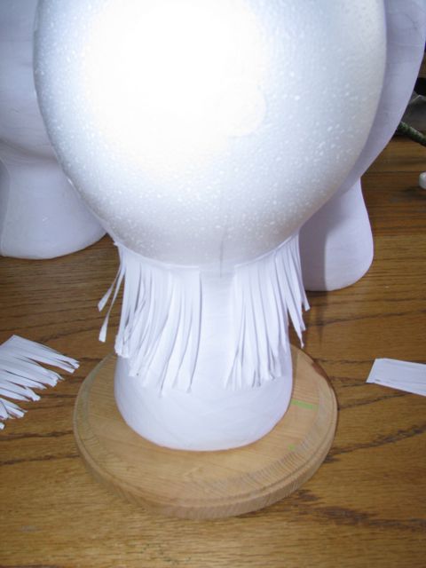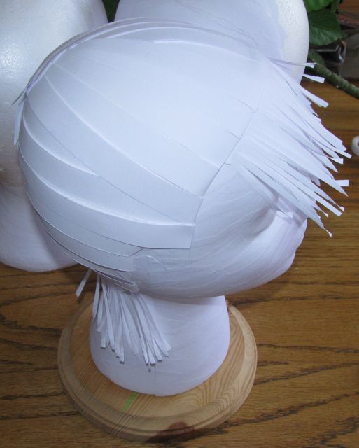 3) The last method was to use scrap quilt batting circles that I glued the head. I started with smaller circles and stacked the up in ever-larger circles until I was within about an inch of the hairline. Sorry I do not have pictures of this. The batting needs to be covered with the 3/4 “ strips as above.