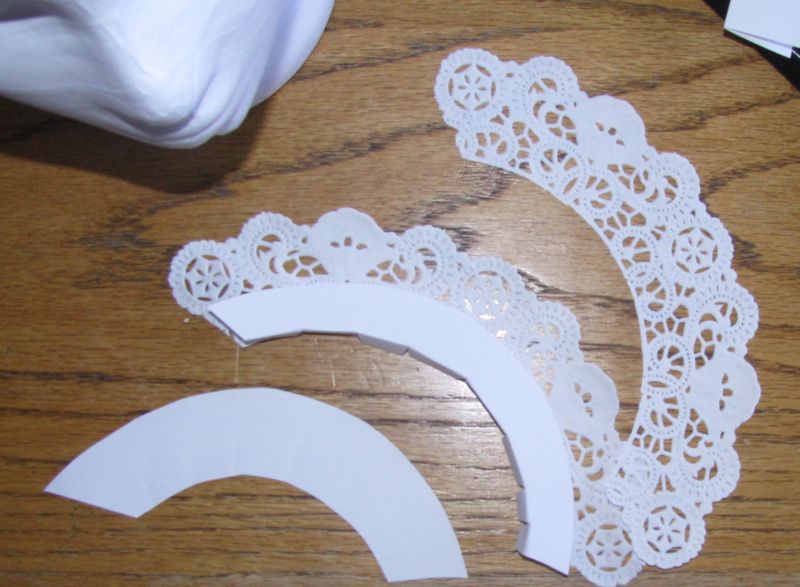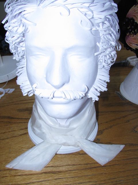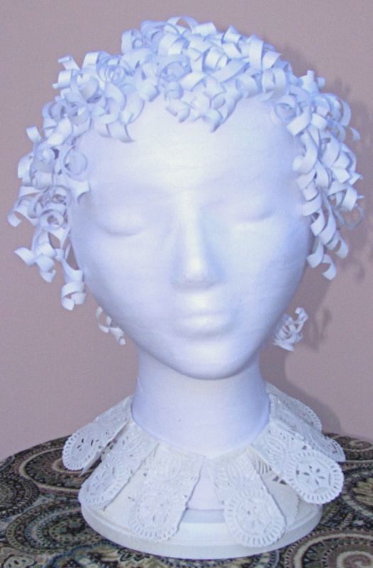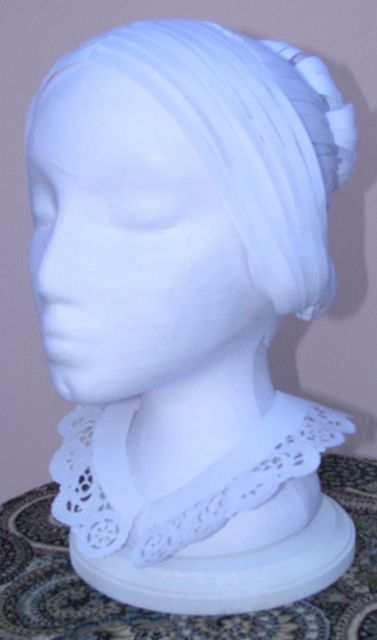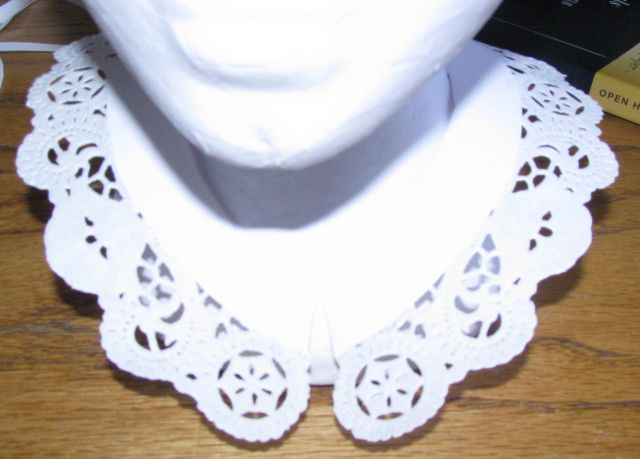 After I did a couple of these heads the necks seemed bare, I had to come up with something. Most of the everyday fashion from this time period calls for a high stand up collar something I could make with paper doilies. Heart shaped doilies worked very well but I wanted some variety so I moved on to round doilies of different sized. Between my local craft, party and cake decorating stores I found 7 to 8 different types and just fiddled until I came up with something I could do for every head, except for the 1926, the 1850 and the man’s head. When working with paper doilies fabric tac glue worked much better than tacky paper glue because it did not melt them. I used paper to make a very large fold back collar for the 1926 head. I used two half circles of paper with the outside edge of a doily glued to the outside edge for an 1850 collar. The inside edge of the paper needed to be clipped so it could be glued to a piece of paper that went around the neck like a collar band. For the man’s neck a piece of paper for the high collar and tissue for a cravat did the trick. It started with the center of the folded tissue in the center front and the ends wrapped around the back and tied in the front with a knot. Even with the 1919 collar I used part of a doily as a decoration in the center back of the collar.