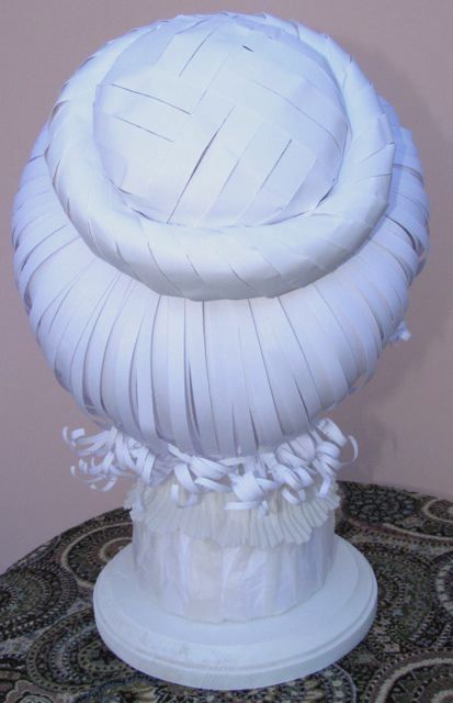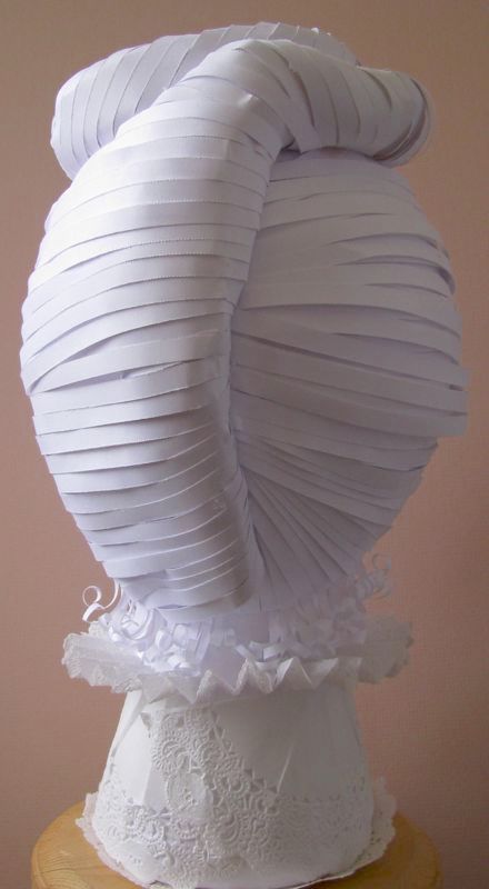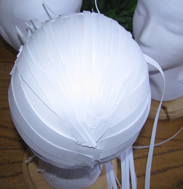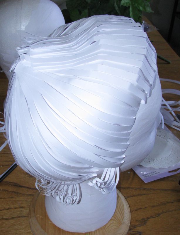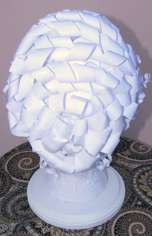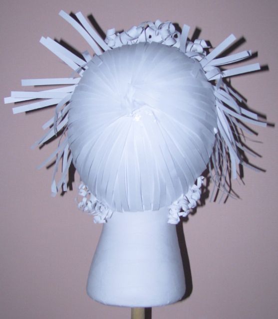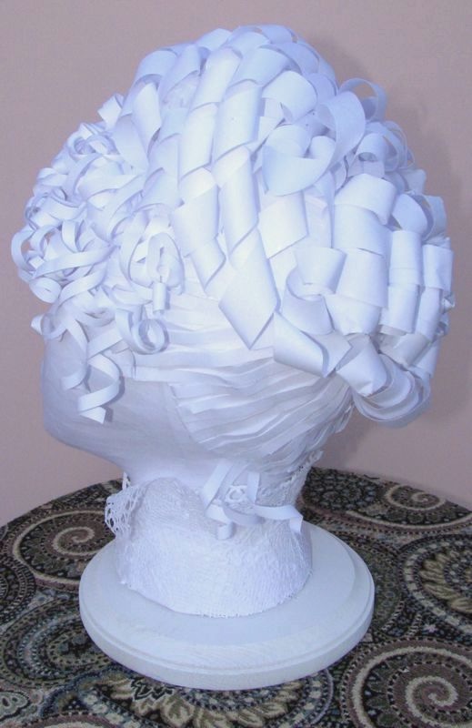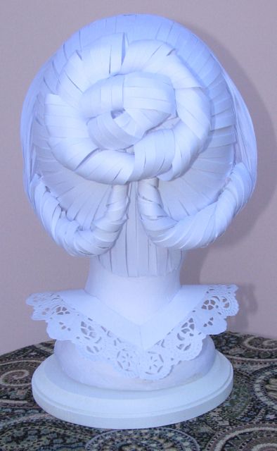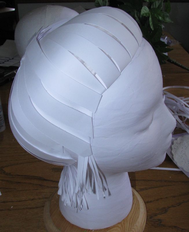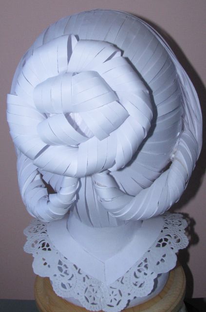 2) Another type of chignon (#3) is made with wide strips of paper that is twisted into a spiral and glued down to the head where it touches it. I started at the center and spiraled out from that until the chignon was the correct size.
