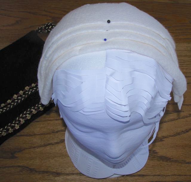 4) The last method was to use large circles of batting folded in half and pinned to the head. This can be used if the hat will be covering all the batting and there is no need for any ¼” hair to be added above the padding