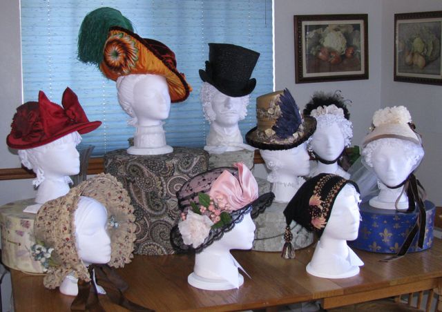 It has always bothered me that when I needed to display a period hat I could not really display it as it would have been worn on a head form without hair. So, when I was asked to bring a collection of 19th and early 20th century hats to Costume College I wanted to come up with a way to display them that illustrated not only the changes in hat styles but also the changes in hairstyles. I really admired the paper hairdos in the Kyoto Costume Institute’s book “Fashion: a history from the 18th to the 20th century” so I set out to make a set of heads. The hats I chose to be in the display where made between 2005 and 2011 either as prototypes for patterns or as teaching aids for workshops and run from early Victorian to mid-1920s in style. As a reference for the hairstyles that would have been worn with the hats I went again to my favorite hat and hairstyle reference book Ruth Turner Wilcox’s “The mode in hats and headdresses”. I have some experience in making yarn wigs for dolls and in my first attempts I treated the paper just as if it was yarn. I was never able to make hairstyles with the 1” wide strips the Institute seem to be able to work with so, I moved down to 1/2, 1/4 and 1/8” strips. Braids for chignons so much a part of any hairstyle in the 19th Century where difficult with flat strips of paper so I keep trying different things. Curls however are fairly easy and fun. Each head took any where from half a day to a full day to finish. I did make two heads before I realized it is also important to cover the face with paper mostly because the color and surface texture of Styrofoam just did not match the paper hair and the deference was heightened in photos.