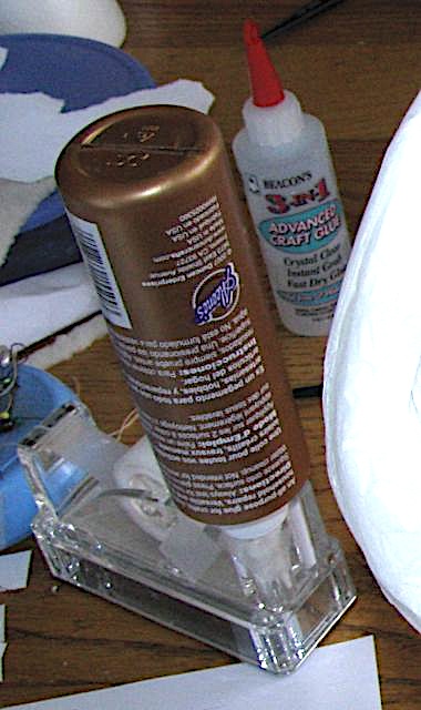 5) A tape dispenser that can be modified to hold your paper glue with the tip down so you do not need to wait for glue. There will be times when you need just one drop and then you need to put it down to attach a piece of paper then another drop of glue and so on. If you have to wait for a drop of glue it really slows down the glue. I glued two tips from old empty bottles of glue into the pen holes in my tape dispenser until the bottle could snap into place and stand by itself.