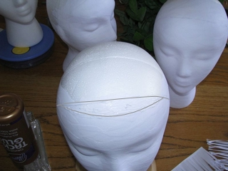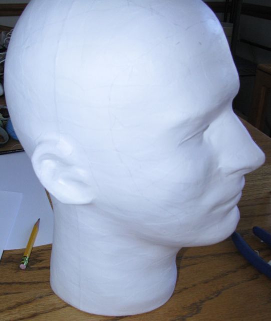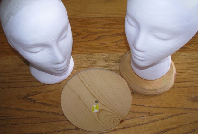6) Some kind of base to keep the head from falling over. I used 6” round wooden plaques from the craft store. I added a 4” length of ¾” wooden dowels held in place with a 1-3/4” wallboard shrew that I counter sunk. These I painted white with matt spray paint. If you do not have access to wood tools you could of course just glue your Styrofoam head to the plaque after it is painted.