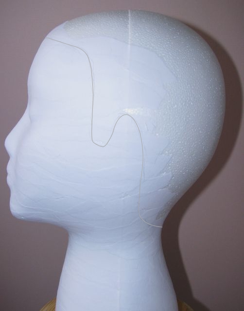 On the right side of the head glued strips from the sideburn area to center back with a little ease over the invisible ear.