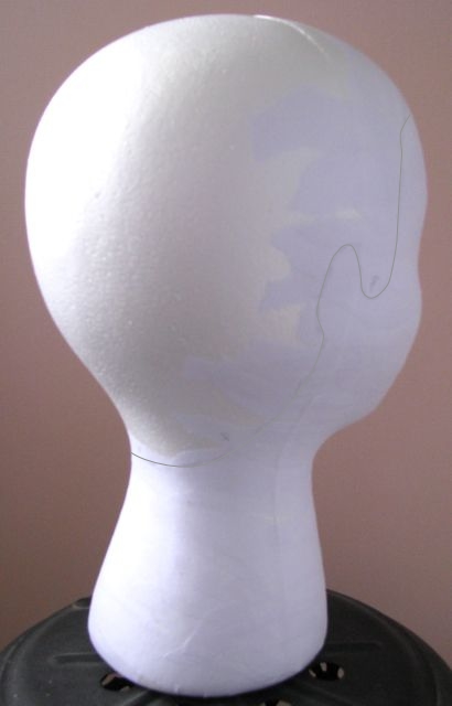 After the face is dry I used a pencil to mark the hairline following the facial features of the head. Most Styrofoam heads do not have ears but it is still important to mark for the side burns. In most females the bottom of the side burns are even with the bottom of the eyes so use that as a guide. As you are marking the hairline view the head from the front and the side over and over that should help you get it symmetrical. There is a change in slope between the forehead and the start of the hair so if you mark along this change you should have a good hairline. You should mark for a part with two parallel lines so that there will not be pencil in the blank space left when you part your paper hair. You should also mark the areas on the head where you will have paper that makes the bangs and longer paper that makes the regular hair. Also if you are doing a male head mark the long sideburns if they are period. There is no need to mark for a mustache you can just use the upper lip as a reference but do mark for the area of any beard.
