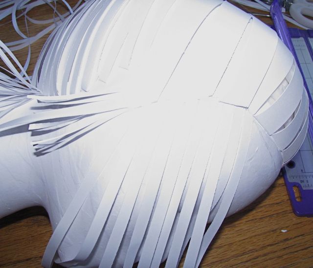 Add parallel lines of glue about every 1/2″ over from the part on the right to just above the ears and add a row of 1/8″ strips over each line of glue.