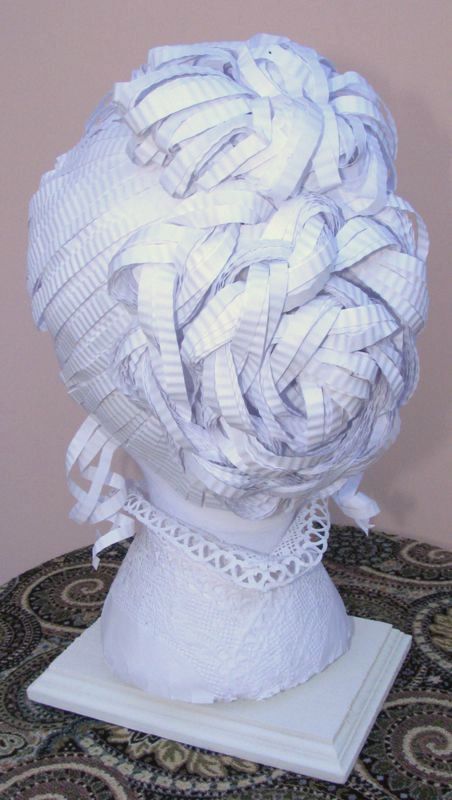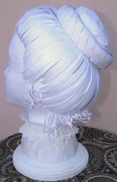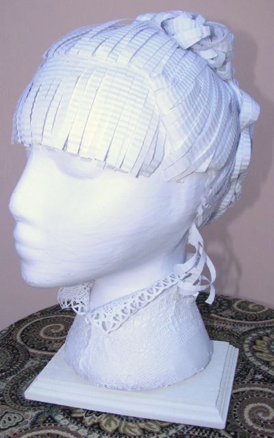 I ended up with quite a few heads and storage and display room got tight so, I realized that going forward I could do these hairstyles as wigs and I would only have to store wigs and have only a couple heads. So, I started by covering the face and neck area with paper maché as before and drew on a hairline. Then I covered the head with plastic wrap and draped the head with wet, medium weight buckram that I held in place with a rubber band to dry. When this was dry I created the hairstyle just as I did before. When the glue was dry I loosened the buckram from the head cutting some of the buckram where it was necessary. When I could pry the paper wig off the head I trimmed the buckram base so that it did not show when I slipped the wig back on the head this time without plastic wrap. I needed to pin the wig in place to hold it from slipping but as you can see from the last photos it is impossible to tell that the paper strips where not glued to the head.
