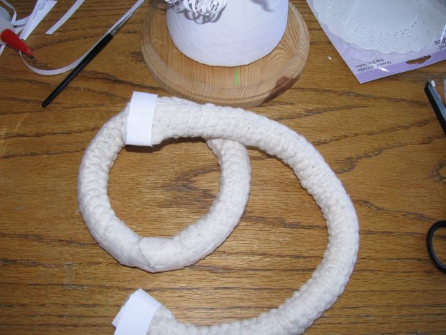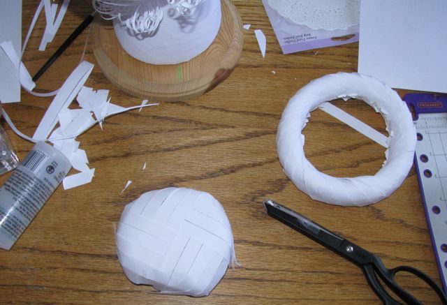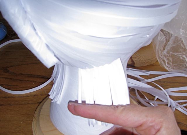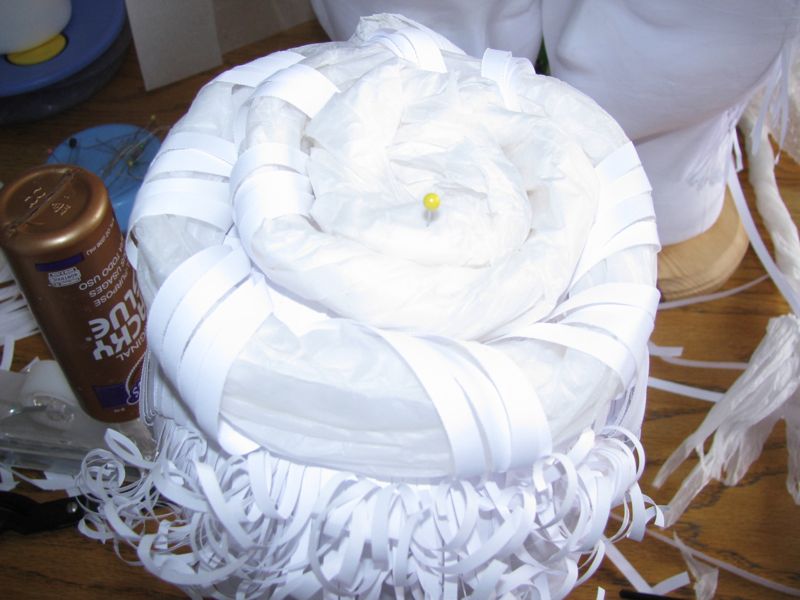 The long strips after having been wrapped around the tissue spiral and the spiral having been pinned back in place.