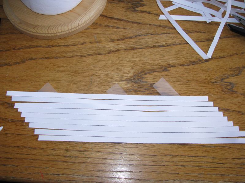 Chignon (#5), short lengths of 3/8″ paper stuck to a piece of tape at an angle. These are glued to the circle of welting with ends on the inside.