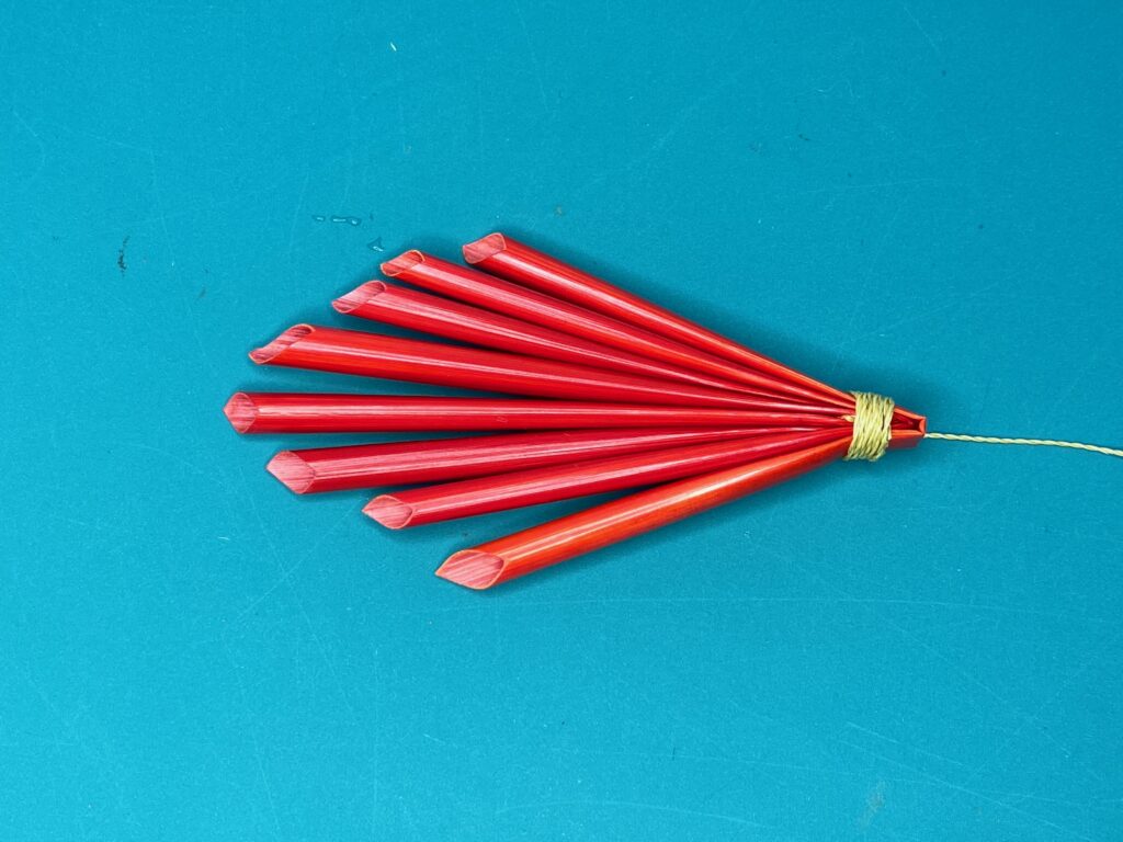 A straw broom is a decoration done with 4 whole straws and a length of straw thread. The straw does need to be soaked to soften. Besides the straw you will need a large eyed sewing needle, a large pearl headed pin, some sharp scissors and some strong sewing thread (nylon or button and carpet).
